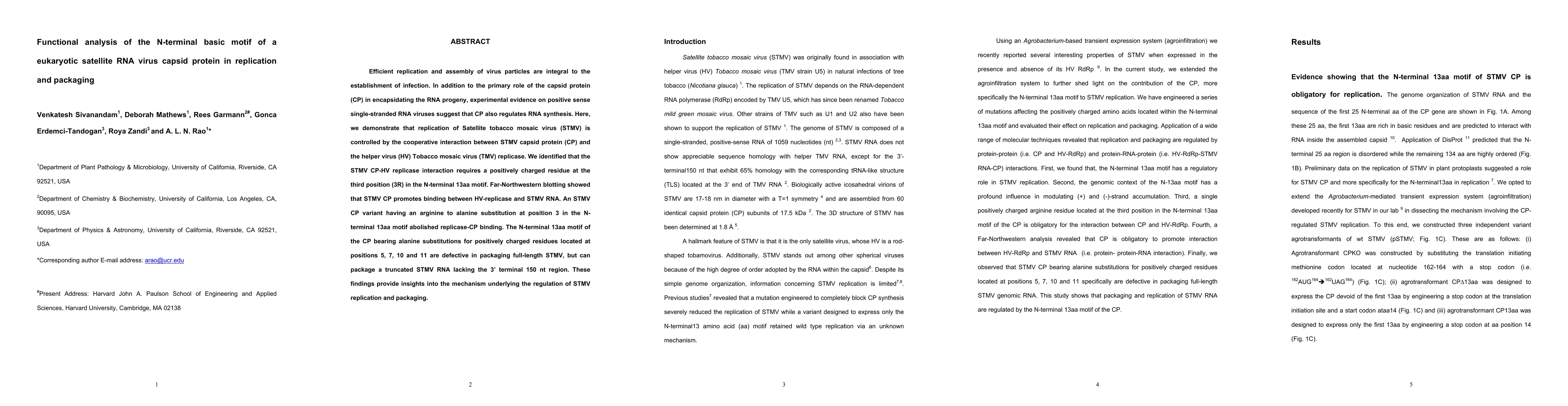 This study elucidates the role of the N-terminal basic motif of the Satellite tobacco mosaic virus capsid protein in replication and RNA packaging. The motif's positively charged residue at position 3 is crucial for interaction with the helper virus replicase, which is essential for efficient replication and RNA packaging.