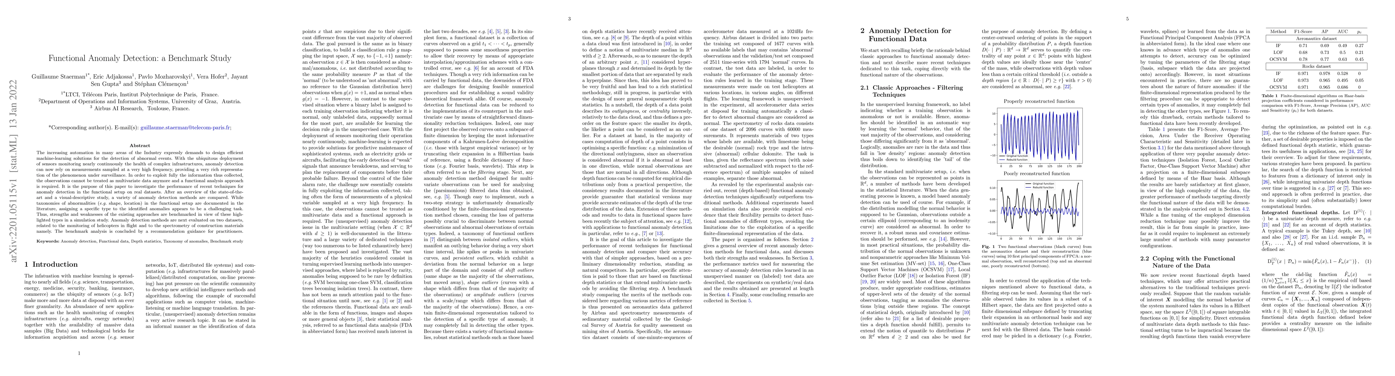 The increasing automation in many areas of the Industry expressly demands to design efficient machine-learning solutions for the detection of abnormal events. With the ubiquitous deployment of sensors monitoring nearly continuously the health of complex infrastructures, anomaly detection can now rely on measurements sampled at a very high frequency, providing a very rich representation of the phenomenon under surveillance. In order to exploit fully the information thus collected, the observations cannot be treated as multivariate data anymore and a functional analysis approach is required. It is the purpose of this paper to investigate the performance of recent techniques for anomaly detection in the functional setup on real datasets. After an overview of the state-of-the-art and a visual-descriptive study, a variety of anomaly detection methods are compared. While taxonomies of abnormalities (e.g. shape, location) in the functional setup are documented in the literature, assigning a specific type to the identified anomalies appears to be a challenging task. Thus, strengths and weaknesses of the existing approaches are benchmarked in view of these highlighted types in a simulation study. Anomaly detection methods are next evaluated on two datasets, related to the monitoring of helicopters in flight and to the spectrometry of construction materials namely. The benchmark analysis is concluded by recommendation guidance for practitioners.
