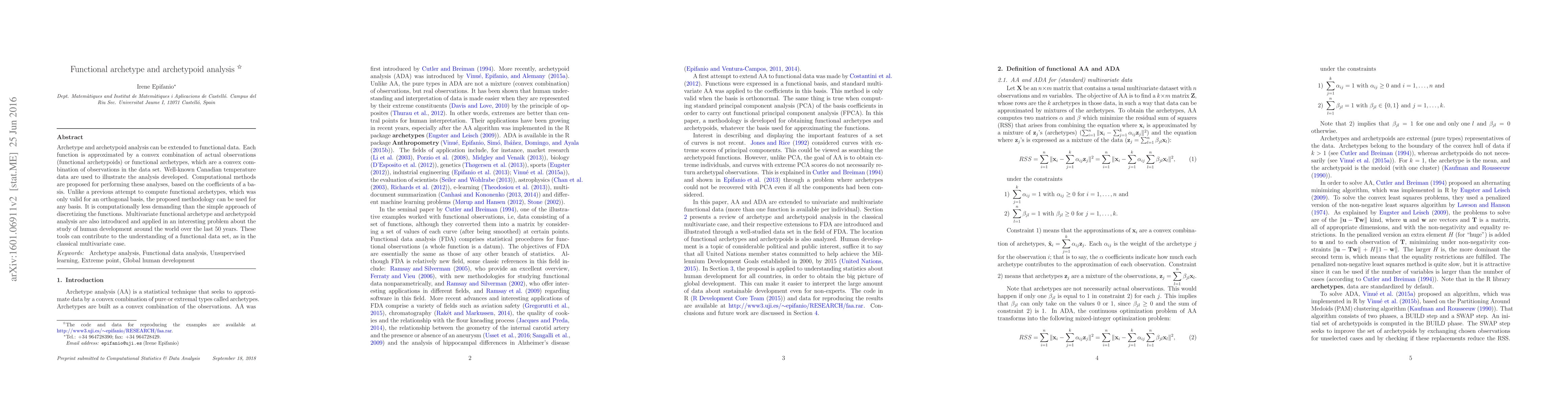 Archetype and archetypoid analysis can be extended to functional data. Each function is represented as a mixture of actual observations (functional archetypoids) or functional archetypes, which are a mixture of observations in the data set. Well-known Canadian temperature data are used to illustrate the analysis developed. Computational methods are proposed for performing these analyses, based on the coefficients of a basis. Unlike a previous attempt to compute functional archetypes, which was only valid for an orthogonal basis, the proposed methodology can be used for any basis. It is computationally less demanding than the simple approach of discretizing the functions. Multivariate functional archetype and archetypoid analysis are also introduced and applied in an interesting problem about the study of human development around the world over the last 50 years. These tools can contribute to the understanding of a functional data set, as in the multivariate case.