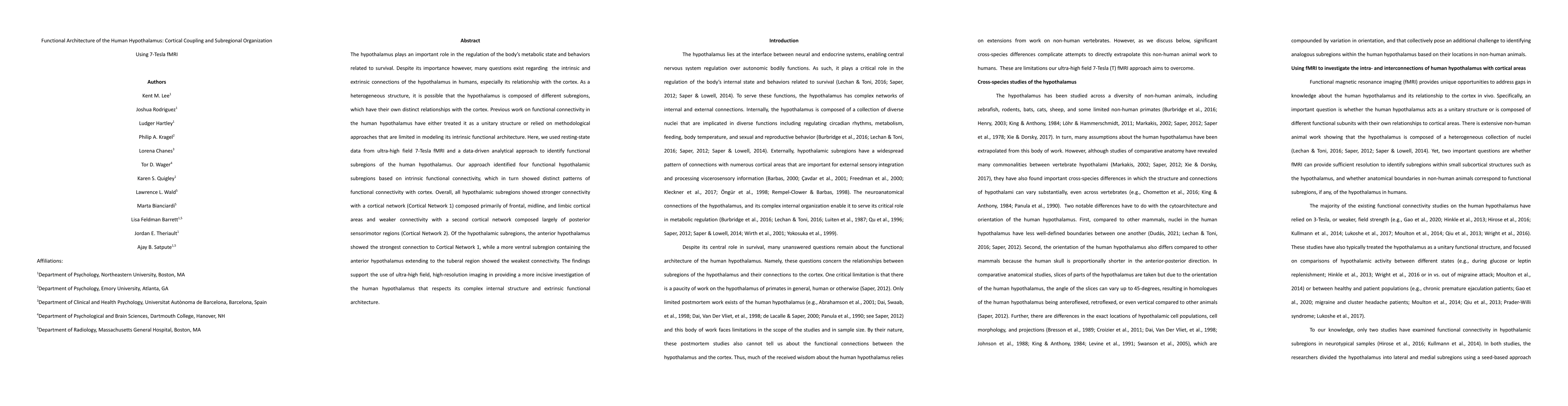Researchers identified four functional subregions within the human hypothalamus using 7-Tesla fMRI, revealing distinct patterns of connectivity with two cortical networks: Cortical Network 1 and Cortical Network 2.