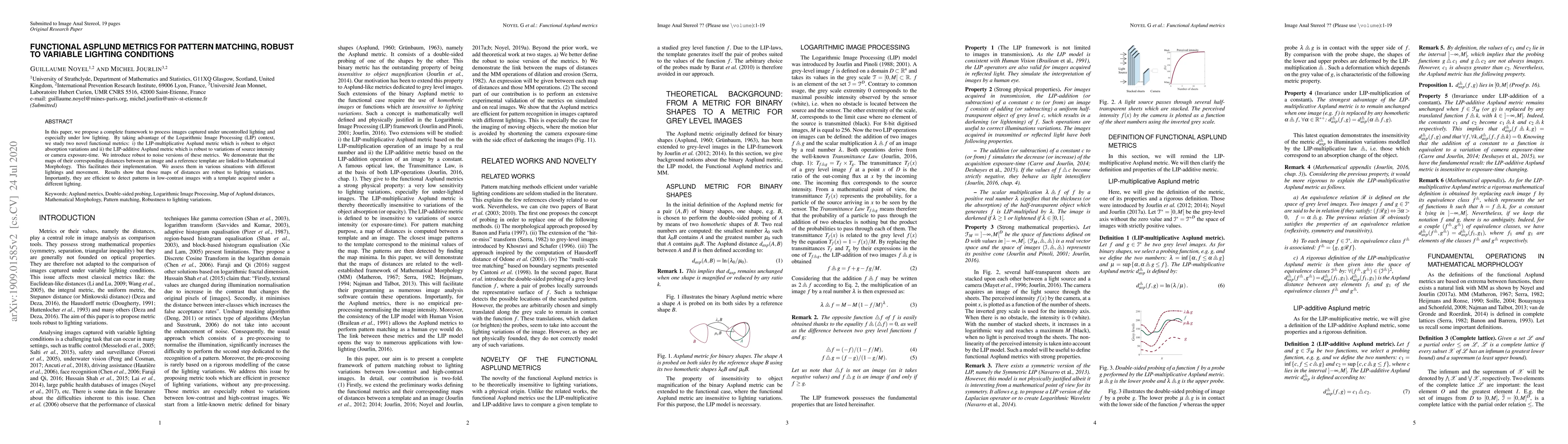 In this paper, we propose a complete framework to process images captured under uncontrolled lighting and especially under low lighting. By taking advantage of the Logarithmic Image Processing (LIP) context, we study two novel functional metrics: i) the LIP-multiplicative Asplund metric which is robust to object absorption variations and ii) the LIP-additive Asplund metric which is robust to variations of source intensity or camera exposure-time. We introduce robust to noise versions of these metrics. We demonstrate that the maps of their corresponding distances between an image and a reference template are linked to Mathematical Morphology. This facilitates their implementation. We assess them in various situations with different lightings and movement. Results show that those maps of distances are robust to lighting variations. Importantly, they are efficient to detect patterns in low-contrast images with a template acquired under a different lighting.