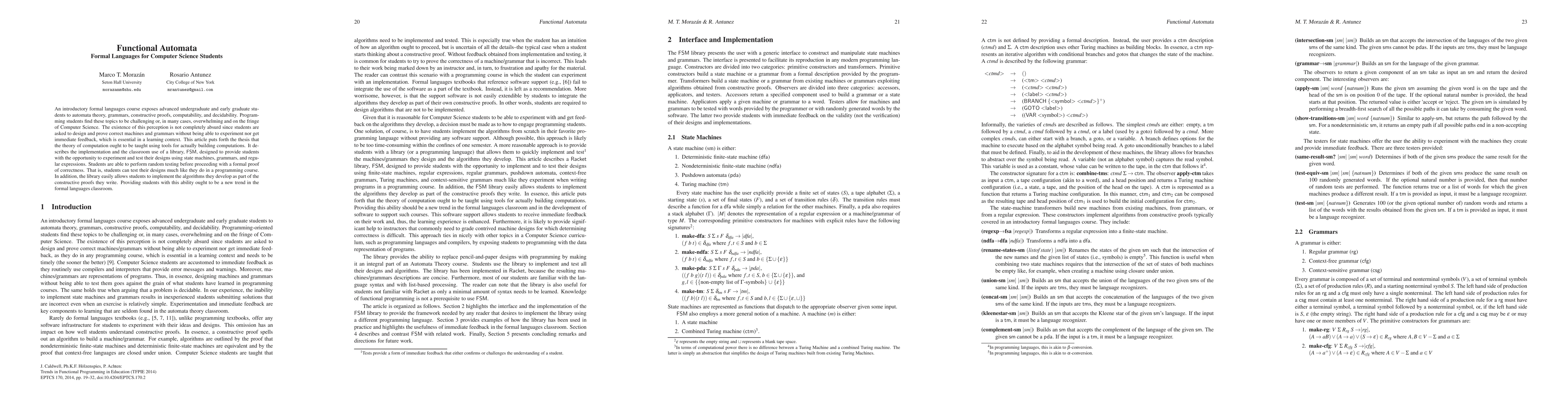 An introductory formal languages course exposes advanced undergraduate and early graduate students to automata theory, grammars, constructive proofs, computability, and decidability. Programming students find these topics to be challenging or, in many cases, overwhelming and on the fringe of Computer Science. The existence of this perception is not completely absurd since students are asked to design and prove correct machines and grammars without being able to experiment nor get immediate feedback, which is essential in a learning context. This article puts forth the thesis that the theory of computation ought to be taught using tools for actually building computations. It describes the implementation and the classroom use of a library, FSM, designed to provide students with the opportunity to experiment and test their designs using state machines, grammars, and regular expressions. Students are able to perform random testing before proceeding with a formal proof of correctness. That is, students can test their designs much like they do in a programming course. In addition, the library easily allows students to implement the algorithms they develop as part of the constructive proofs they write. Providing students with this ability ought to be a new trend in the formal languages classroom.