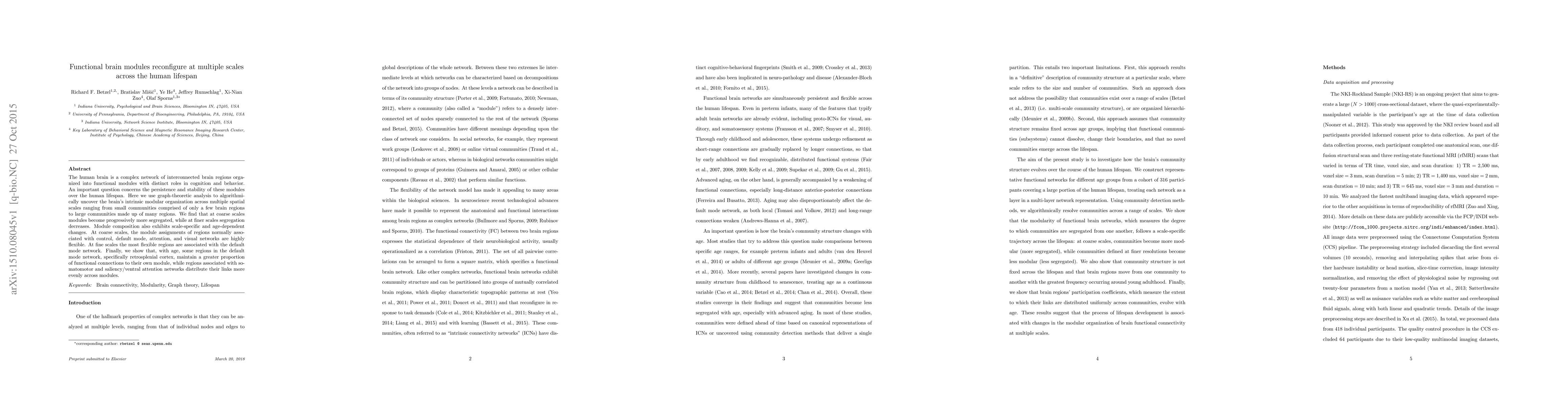 This study reveals that functional brain modules exhibit age-dependent reconfiguration across multiple spatial scales, with coarse-scale modules becoming more segregated and fine-scale modules showing decreased segregation. Age-related changes in module flexibility highlight the default mode network's adaptability, particularly in the retrosplenial cortex.
