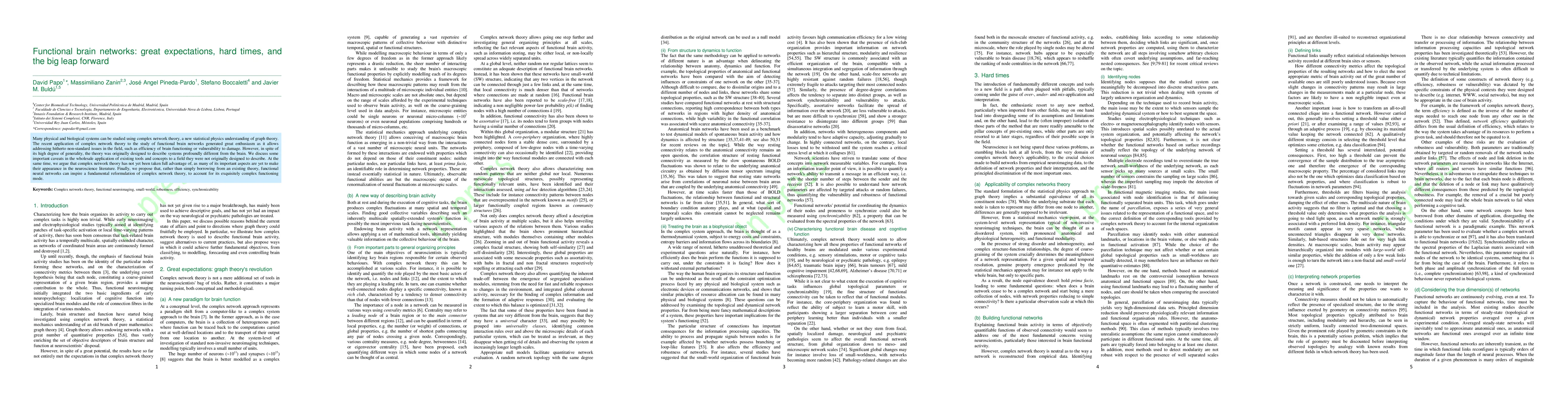 Many physical and biological systems can be studied using complex network theory, a new statistical physics understanding of graph theory. The recent application of complex network theory to the study of functional brain networks generated great enthusiasm as it allows addressing hitherto non-standard issues in the field, such as efficiency of brain functioning or vulnerability to damage. However, in spite of its high degree of generality, the theory was originally designed to describe systems profoundly different from the brain. We discuss some important caveats in the wholesale application of existing tools and concepts to a field they were not originally designed to describe. At the same time, we argue that complex network theory has not yet been taken full advantage of, as many of its important aspects are yet to make their appearance in the neuroscience literature. Finally, we propose that, rather than simply borrowing from an existing theory, functional neural networks can inspire a fundamental reformulation of complex network theory, to account for its exquisitely complex functioning mode.