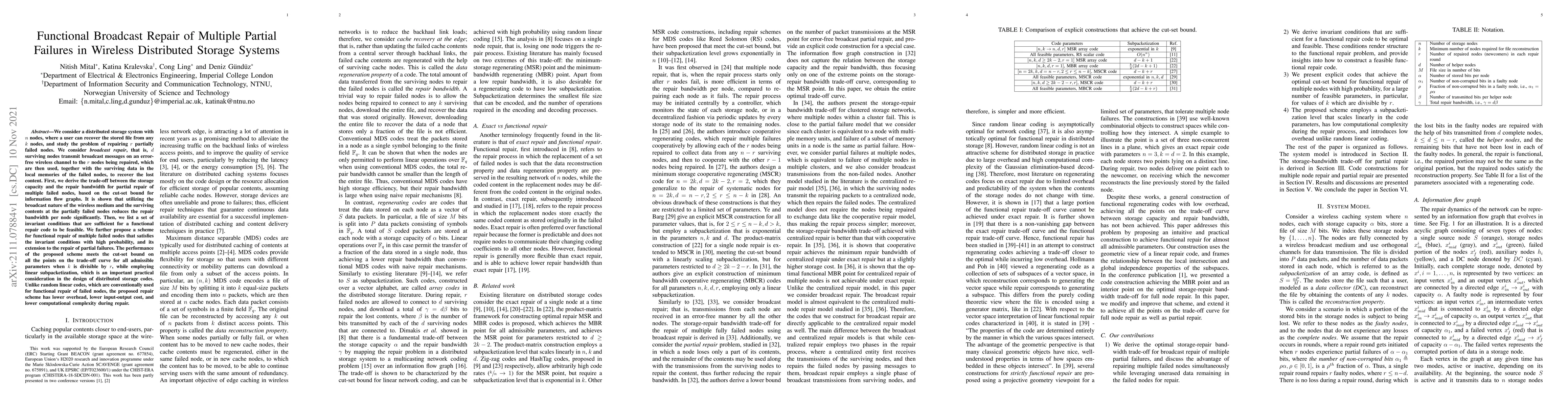 This paper studies broadcast repair for multiple partially failed nodes in distributed storage systems, deriving a trade-off between storage capacity and repair bandwidth. It proposes a scheme that meets the cut-set bound, utilizing broadcast wireless transmission and surviving node data to reduce repair bandwidth, with lower overhead and complexity compared to random linear codes.