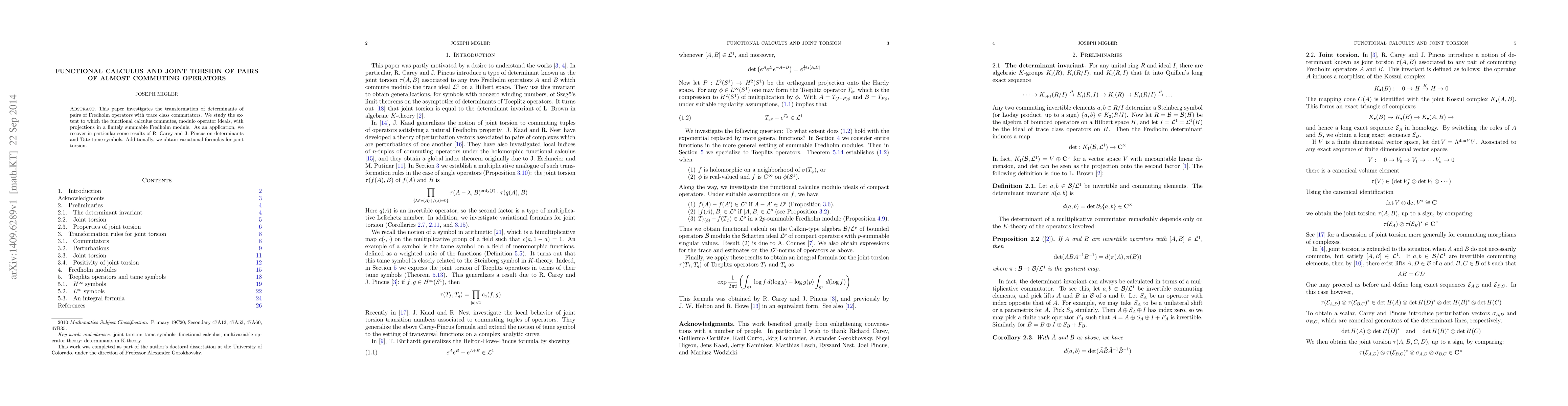 This paper explores the functional calculus of Fredholm operators with trace class commutators, focusing on how it interacts with projections in finitely summable Fredholm modules. It recovers results on determinants and Tate tame symbols and provides variational formulas for joint torsion.