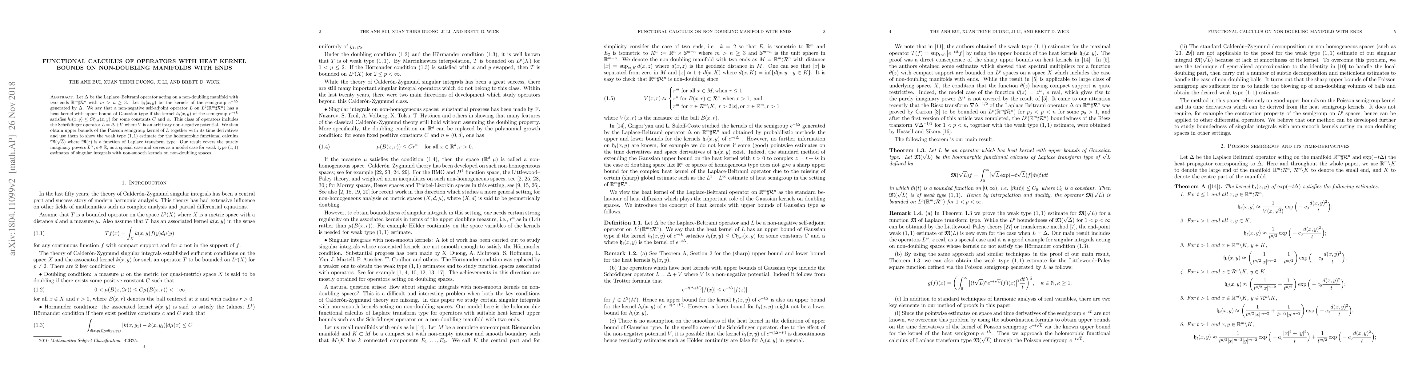 Let $\Delta$ be the Laplace--Beltrami operator acting on a non-doubling manifold with two ends $\mathbb R^m \sharp \mathcal R^n$ with $m > n \ge 3$. Let $\frak{h}_t(x,y)$ be the kernels of the semigroup $e^{-t\Delta}$ generated by $\Delta$. We say that a non-negative self-adjoint operator $L$ on $L^2(\mathbb R^m \sharp \mathcal R^n)$ has a heat kernel with upper bound of Gaussian type if the kernel $h_t(x,y)$ of the semigroup $e^{-tL}$ satisfies $ h_t(x,y) \le C \frak{h}_{\alpha t}(x,y)$ for some constants $C$ and $\alpha$. This class of operators includes the Schr\"odinger operator $L = \Delta + V$ where $V$ is an arbitrary non-negative potential. We then obtain upper bounds of the Poisson semigroup kernel of $L$ together with its time derivatives and use them to show the weak type $(1,1)$ estimate for the holomorphic functional calculus $\frak{M}(\sqrt{L})$ where $\frak{M}(z)$ is a function of Laplace transform type. Our result covers the purely imaginary powers $L^{is}, s \in \mathbb R$, as a special case and serves as a model case for weak type $(1,1)$ estimates of singular integrals with non-smooth kernels on non-doubling spaces.