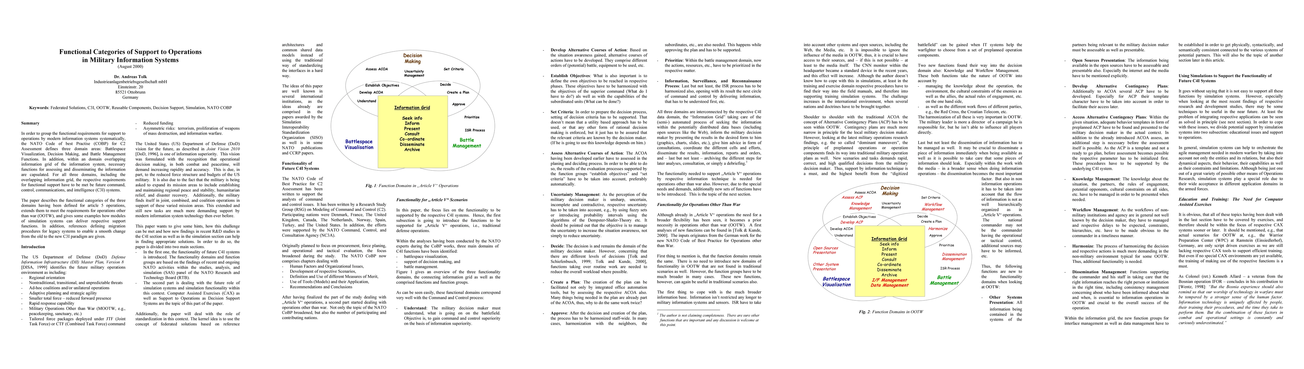 In order to group the functional requirements for support to operations by modern information systems systematically, the NATO Code of best Practise (COBP) for C2 Assessment defines three domain areas: Battlespace Visualization, Decision Making, and Battle Management Functions. In addition, within an domain overlapping information grid of the information system, necessary functions for assessing and disseminating the information are capsulated. For all three domains, including the overlapping information grid, the respective requirements for functional support have to be met be future command, control, communications, and intelligence (C3I) systems. The paper describes the functional categories of the three domains having been defined for article 5 operations, extends them to meet the requirements for operations other than war (OOTW), and gives some examples how modules of simulation systems can deliver respective support functions. In addition, references defining migration procedures for legacy systems to enable a smooth change from the old to the new C3I paradigm are given.