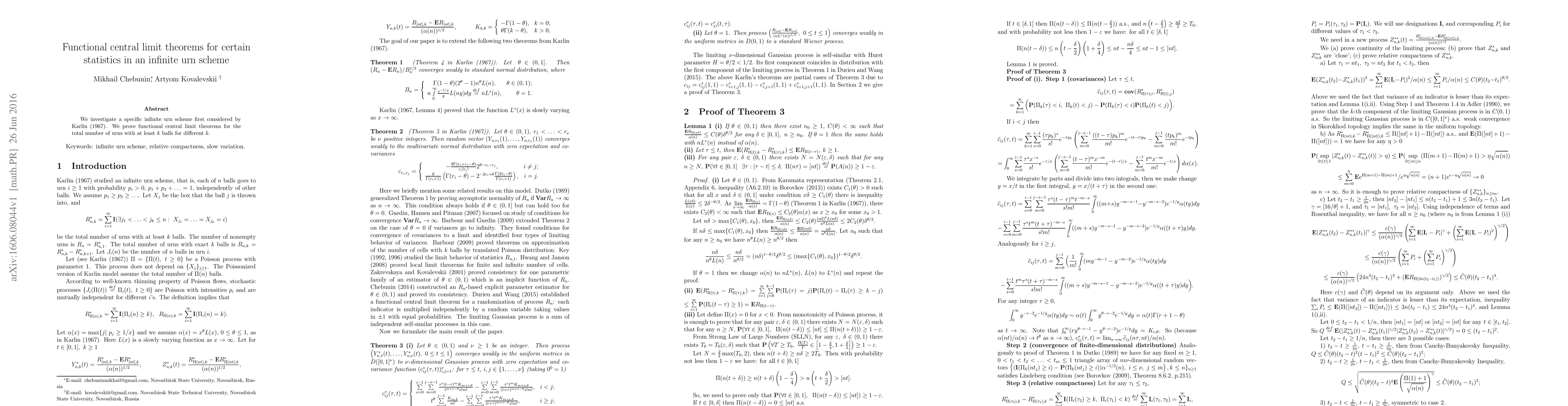 Summary: This paper examines a specific infinite urn model initially proposed by Karlin in 1967, proving functional central limit theorems for the total number of urns containing at least k balls across various k values.