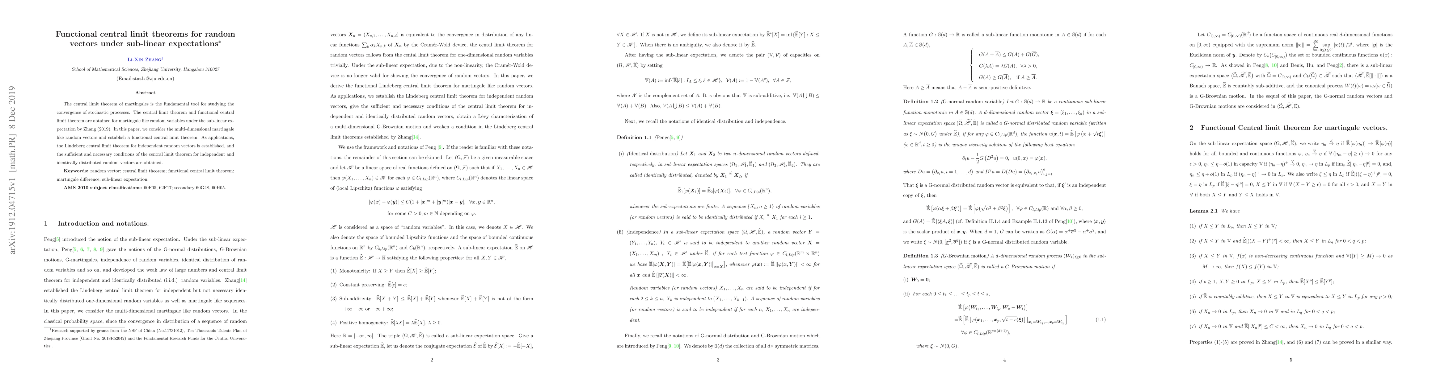 This paper establishes a functional central limit theorem for multi-dimensional random vectors under sub-linear expectations, extending previous results for martingales. It also provides applications including the Lindeberg central limit theorem for independent random vectors and conditions for the central limit theorem for i.i.d. random vectors.