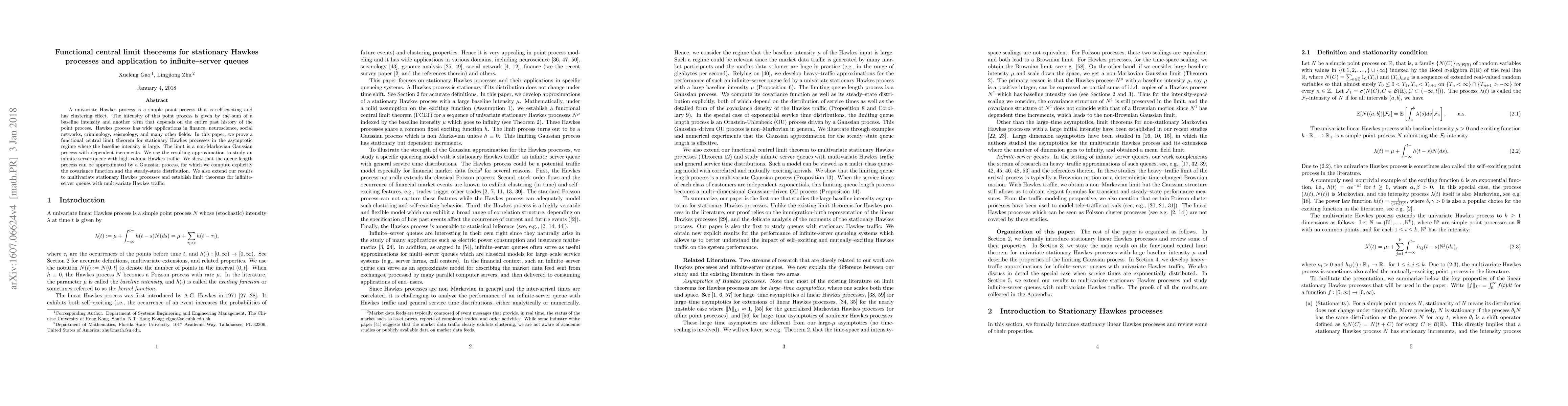 A univariate Hawkes process is a simple point process that is self-exciting and has clustering effect. The intensity of this point process is given by the sum of a baseline intensity and another term that depends on the entire past history of the point process. Hawkes process has wide applications in finance, neuroscience, social networks, criminology, seismology, and many other fields. In this paper, we prove a functional central limit theorem for stationary Hawkes processes in the asymptotic regime where the baseline intensity is large. The limit is a non-Markovian Gaussian process with dependent increments. We use the resulting approximation to study an infinite-server queue with high-volume Hawkes traffic. We show that the queue length process can be approximated by a Gaussian process, for which we compute explicitly the covariance function and the steady-state distribution. We also extend our results to multivariate stationary Hawkes processes and establish limit theorems for infinite-server queues with multivariate Hawkes traffic.