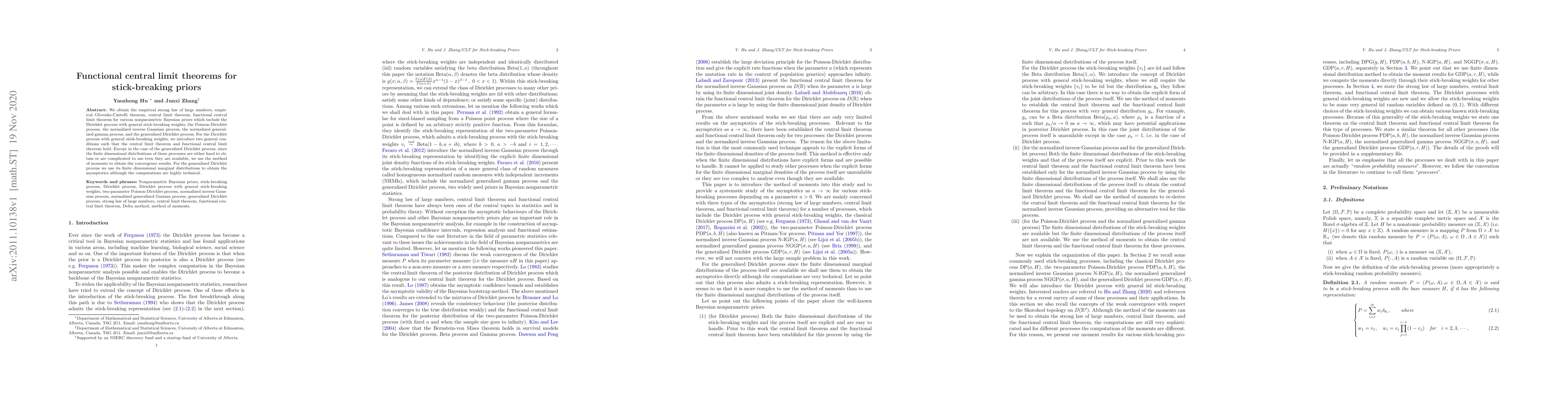 This paper establishes functional central limit theorems for several nonparametric Bayesian priors, including the Dirichlet process with stick-breaking weights, Poisson-Dirichlet process, and others, using the method of moments and finite-dimensional marginal distributions. It introduces conditions for the Dirichlet process to ensure central limit and functional central limit theorems.