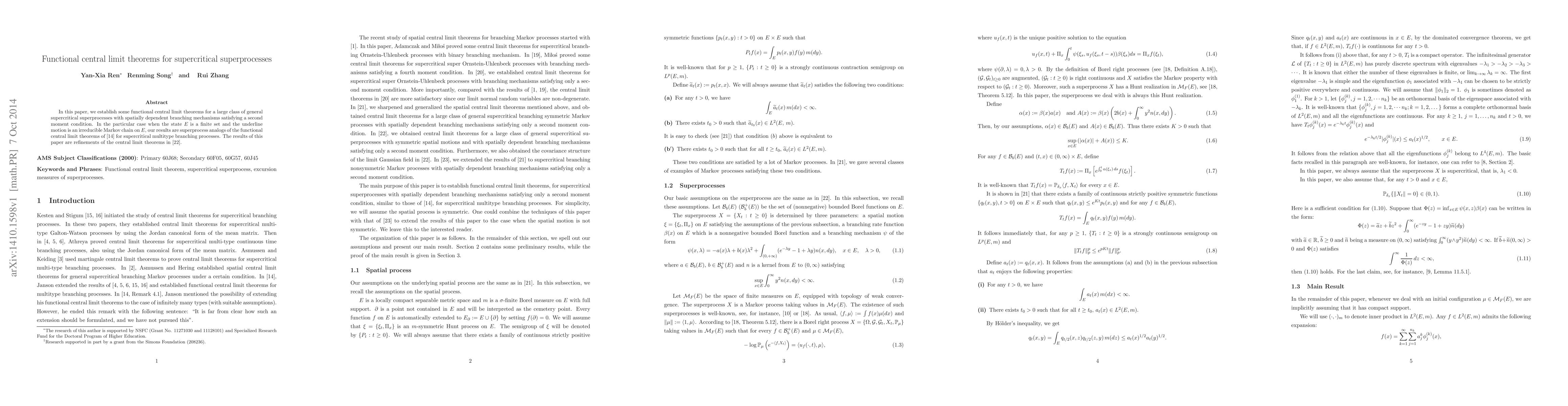 This paper establishes functional central limit theorems for a broad class of supercritical superprocesses with spatially dependent branching mechanisms. The results refine previous central limit theorems and extend the findings of Janson to superprocess analogs.