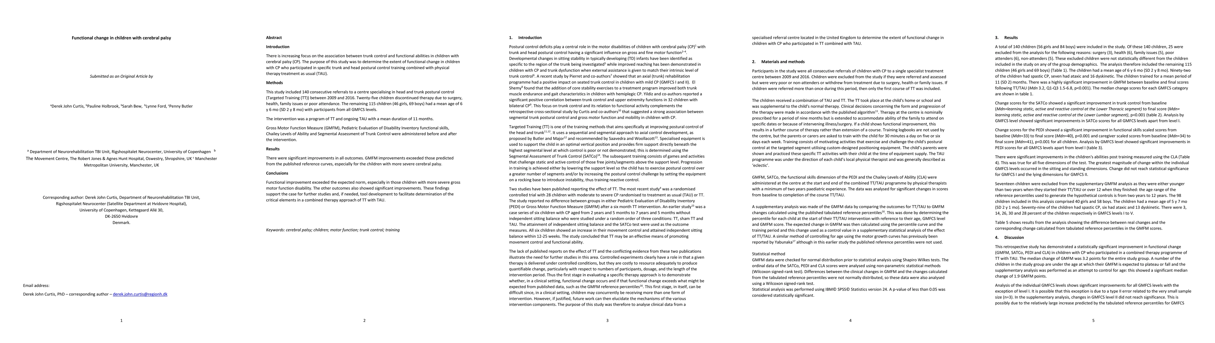 Introduction There is increasing focus on the association between trunk control and functional abilities in children with cerebral palsy (CP). The purpose of this study was to determine the extent of functional change in children with CP who participated in specific trunk and head postural control training combined with physical therapy treatment as usual (TAU). Methods This study included 140 consecutive referrals to a centre specialising in head and trunk postural control (Targeted Training (TT)) between 2009 and 2016. Twenty-five children discontinued therapy due to surgery, health, family issues or poor attendance. The remaining 115 children (46 girls, 69 boys) had a mean age of 6 y 6 mo (SD 2 y 8 mo) with participants from all GMFCS levels. The intervention was a program of TT and ongoing TAU with a mean duration of 11 months. Gross Motor Function Measure (GMFM), Pediatric Evaluation of Disability Inventory functional skills, Chailey Levels of Ability and Segmental Assessment of Trunk Control were administered before and after the intervention. Results There were significant improvements in all outcomes. GMFM improvements exceeded those predicted from the published reference curves, especially for the children with more severe cerebral palsy. Conclusions Functional improvement exceeded the expected norm, especially in those children with more severe gross motor function disability. The other outcomes also showed significant improvements. These findings support the case for further studies and, if needed, tool development to facilitate determination of the critical elements in a combined therapy approach of TT with TAU.