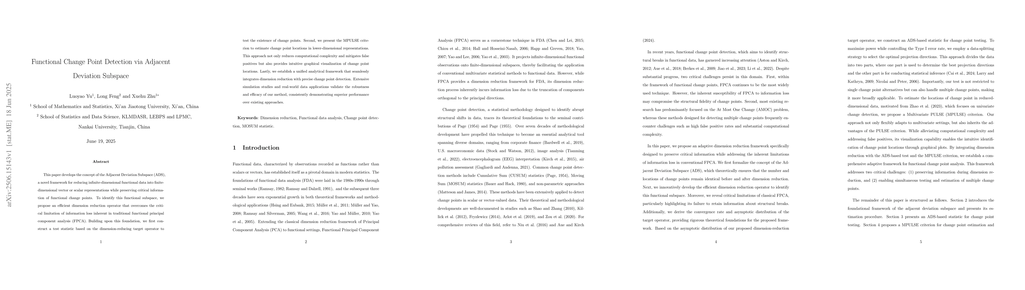 This paper develops the concept of the Adjacent Deviation Subspace (ADS), a novel framework for reducing infinite-dimensional functional data into finite-dimensional vector or scalar representations while preserving critical information of functional change points. To identify this functional subspace, we propose an efficient dimension reduction operator that overcomes the critical limitation of information loss inherent in traditional functional principal component analysis (FPCA). Building upon this foundation, we first construct a test statistic based on the dimension-reducing target operator to test the existence of change points. Second, we present the MPULSE criterion to estimate change point locations in lower-dimensional representations. This approach not only reduces computational complexity and mitigates false positives but also provides intuitive graphical visualization of change point locations. Lastly, we establish a unified analytical framework that seamlessly integrates dimension reduction with precise change point detection. Extensive simulation studies and real-world data applications validate the robustness and efficacy of our method, consistently demonstrating superior performance over existing approaches.