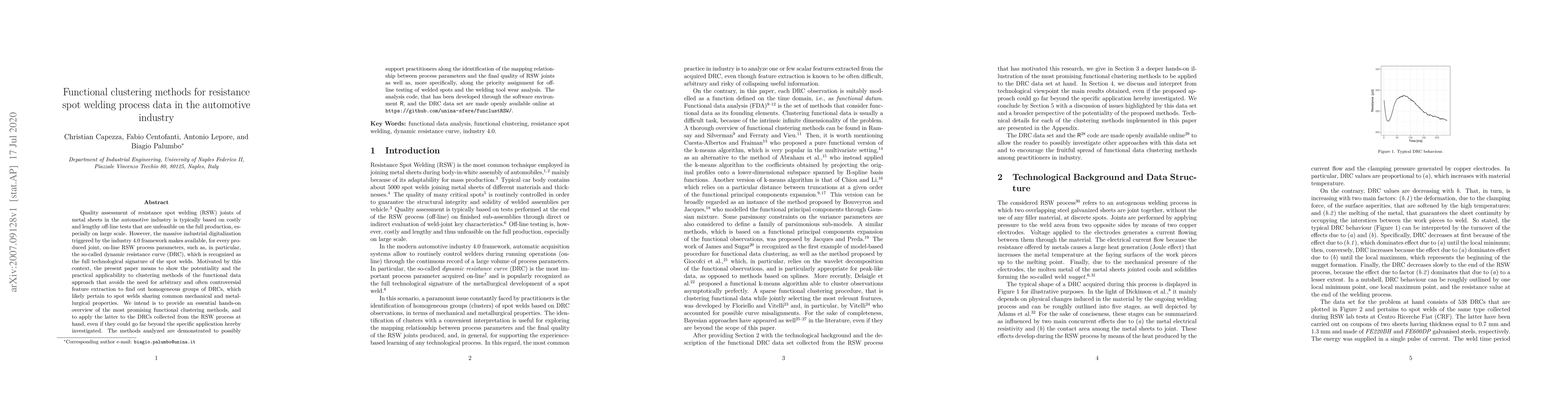 This paper explores using functional clustering methods to analyze resistance spot welding process data in the automotive industry, with a focus on identifying groups of welds with similar mechanical properties. The findings suggest that this approach can help prioritize off-line testing and tool wear analysis, improving quality assessment efficiency.