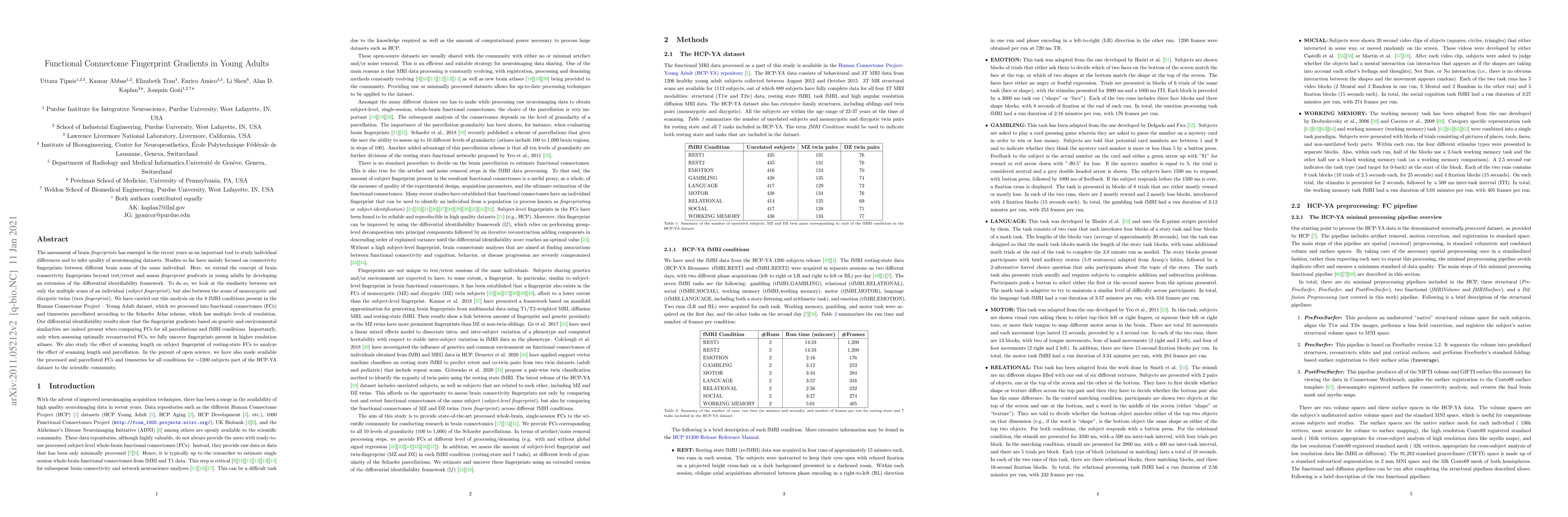 The assessment of brain fingerprints has emerged in the recent years as an important tool to study individual differences and to infer quality of neuroimaging datasets. Studies so far have mainly focused on connectivity fingerprints between different brain scans of the same individual. Here, we extend the concept of brain connectivity fingerprints beyond test/retest and assess fingerprint gradients in young adults by developing an extension of the differential identifiability framework. To do so, we look at the similarity between not only the multiple scans of an individual (subject fingerprint), but also between the scans of monozygotic and dizygotic twins (twin fingerprint). We have carried out this analysis on the 8 fMRI conditions present in the Human Connectome Project -- Young Adult dataset, which we processed into functional connectomes (FCs) and timeseries parcellated according to the Schaefer Atlas scheme, which has multiple levels of resolution. Our differential identifiability results show that the fingerprint gradients based on genetic and environmental similarities are indeed present when comparing FCs for all parcellations and fMRI conditions. Importantly, only when assessing optimally reconstructed FCs, we fully uncover fingerprints present in higher resolution atlases. We also study the effect of scanning length on subject fingerprint of resting-state FCs to analyze the effect of scanning length and parcellation. In the pursuit of open science, we have also made available the processed and parcellated FCs and timeseries for all conditions for ~1200 subjects part of the HCP-YA dataset to the scientific community.