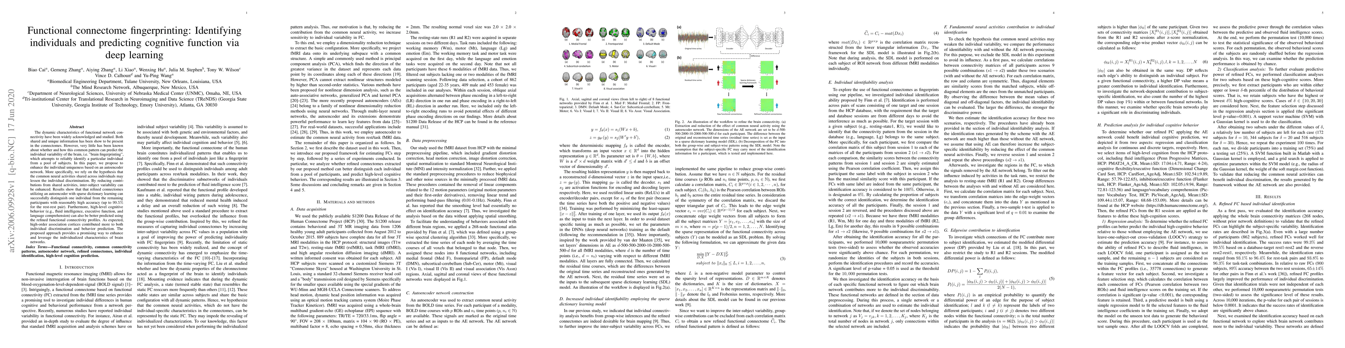 This paper proposes using an autoencoder network to enhance individual brain network uniqueness, enabling "brain fingerprinting" to identify individuals and predict cognitive functions. The refined functional connectivity profiles, achieved by reducing shared neural activities, achieve high accuracy in individual discrimination and better predict cognitive behaviors.