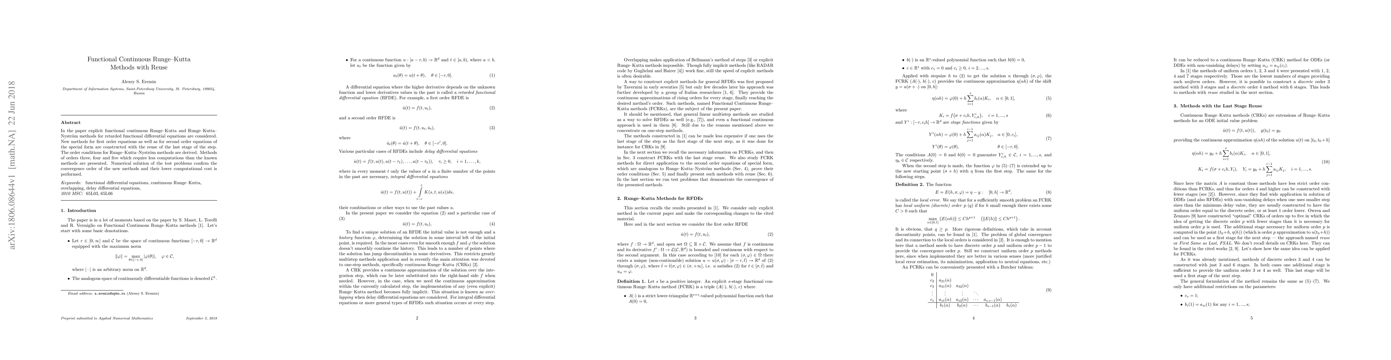 This paper introduces new functional continuous Runge-Kutta and Runge-Kutta-Nyström methods for solving retarded functional differential equations, utilizing the reuse of previous step stages to reduce computational cost. These methods achieve orders three to five with confirmed convergence and lower computational demands compared to existing techniques.