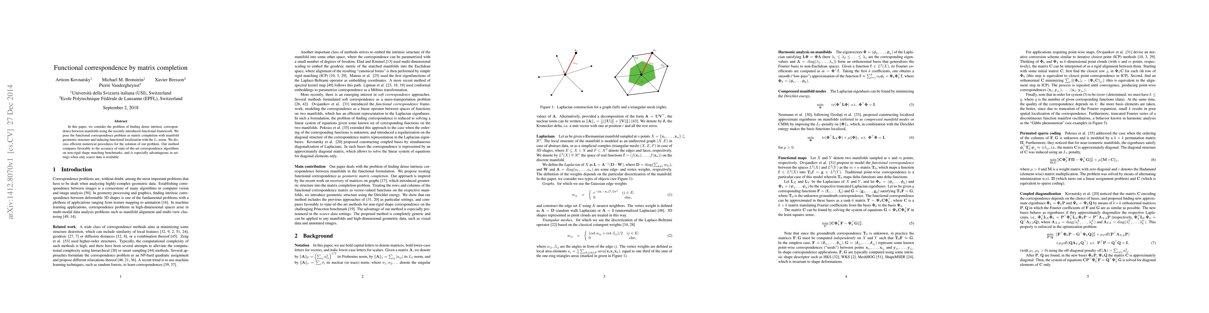 In this paper, we consider the problem of finding dense intrinsic correspondence between manifolds using the recently introduced functional framework. We pose the functional correspondence problem as matrix completion with manifold geometric structure and inducing functional localization with the $L_1$ norm. We discuss efficient numerical procedures for the solution of our problem. Our method compares favorably to the accuracy of state-of-the-art correspondence algorithms on non-rigid shape matching benchmarks, and is especially advantageous in settings when only scarce data is available.