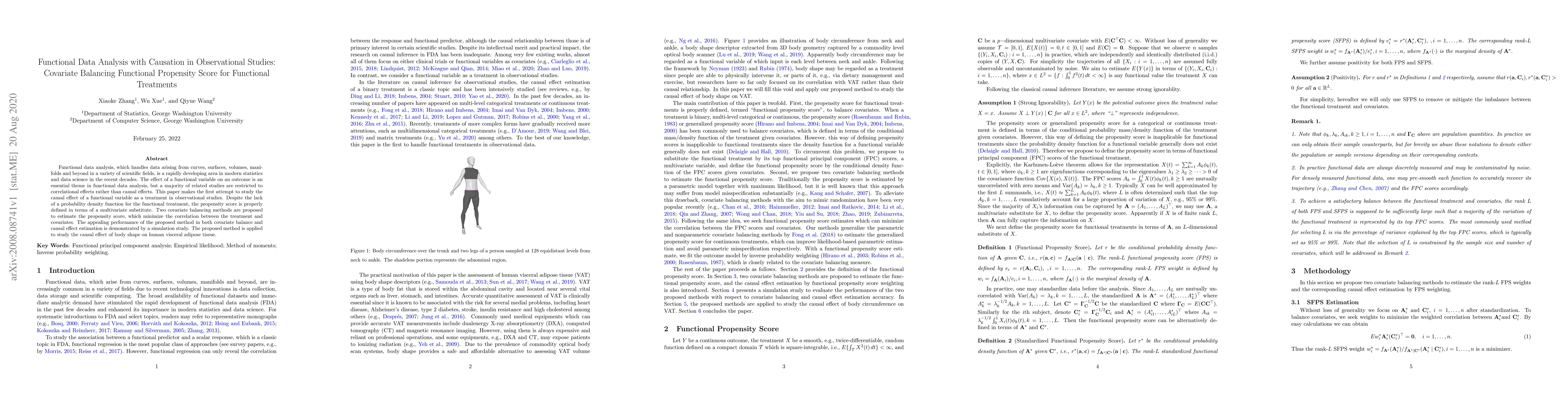 Functional data analysis, which handles data arising from curves, surfaces, volumes, manifolds and beyond in a variety of scientific fields, is a rapidly developing area in modern statistics and data science in the recent decades. The effect of a functional variable on an outcome is an essential theme in functional data analysis, but a majority of related studies are restricted to correlational effects rather than causal effects. This paper makes the first attempt to study the causal effect of a functional variable as a treatment in observational studies. Despite the lack of a probability density function for the functional treatment, the propensity score is properly defined in terms of a multivariate substitute. Two covariate balancing methods are proposed to estimate the propensity score, which minimize the correlation between the treatment and covariates. The appealing performance of the proposed method in both covariate balance and causal effect estimation is demonstrated by a simulation study. The proposed method is applied to study the causal effect of body shape on human visceral adipose tissue.