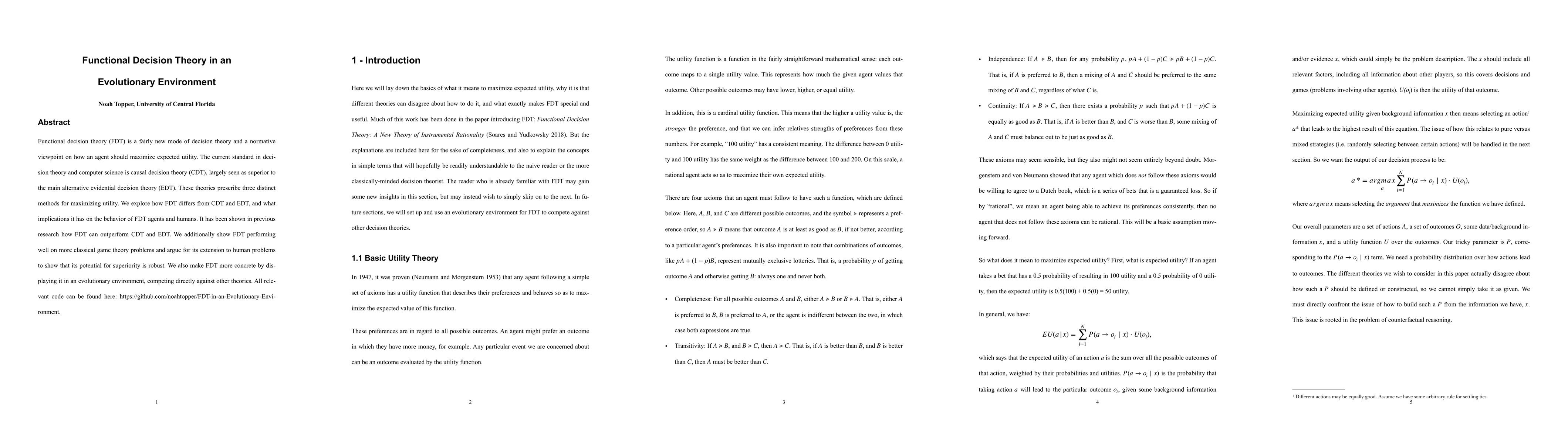 Functional decision theory (FDT) is a fairly new mode of decision theory and a normative viewpoint on how an agent should maximize expected utility. The current standard in decision theory and computer science is causal decision theory (CDT), largely seen as superior to the main alternative evidential decision theory (EDT). These theories prescribe three distinct methods for maximizing utility. We explore how FDT differs from CDT and EDT, and what implications it has on the behavior of FDT agents and humans. It has been shown in previous research how FDT can outperform CDT and EDT. We additionally show FDT performing well on more classical game theory problems and argue for its extension to human problems to show that its potential for superiority is robust. We also make FDT more concrete by displaying it in an evolutionary environment, competing directly against other theories.