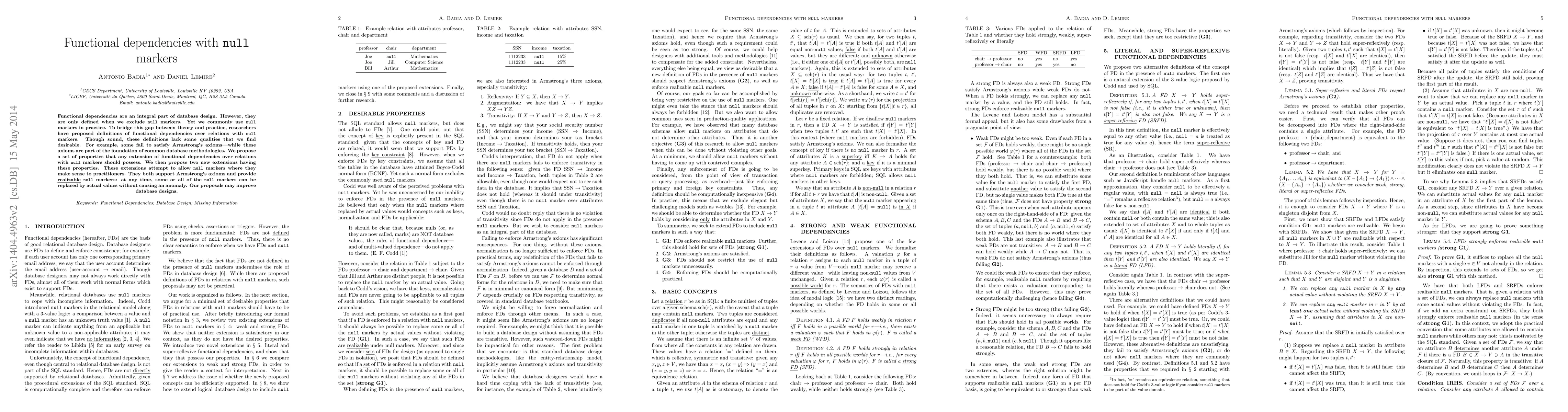 This paper discusses the limitations of current functional dependencies in databases that exclude null markers and proposes new definitions that accommodate null markers while maintaining Armstrong's axioms. The authors suggest two new extensions that allow practical use of null markers without anomalies.