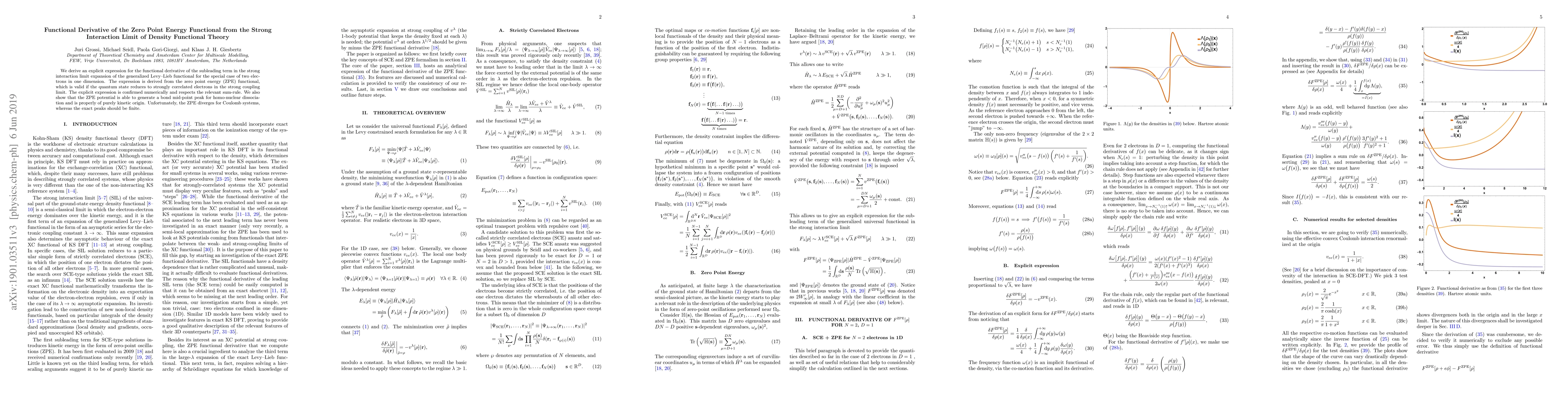 This paper derives an explicit expression for the functional derivative of the subleading term in the strong interaction limit expansion of the generalized Levy-Lieb functional for two electrons in one dimension. The zero point energy functional is shown to generate a bond mid-point peak for homo-nuclear dissociation, though it diverges for Coulomb systems.