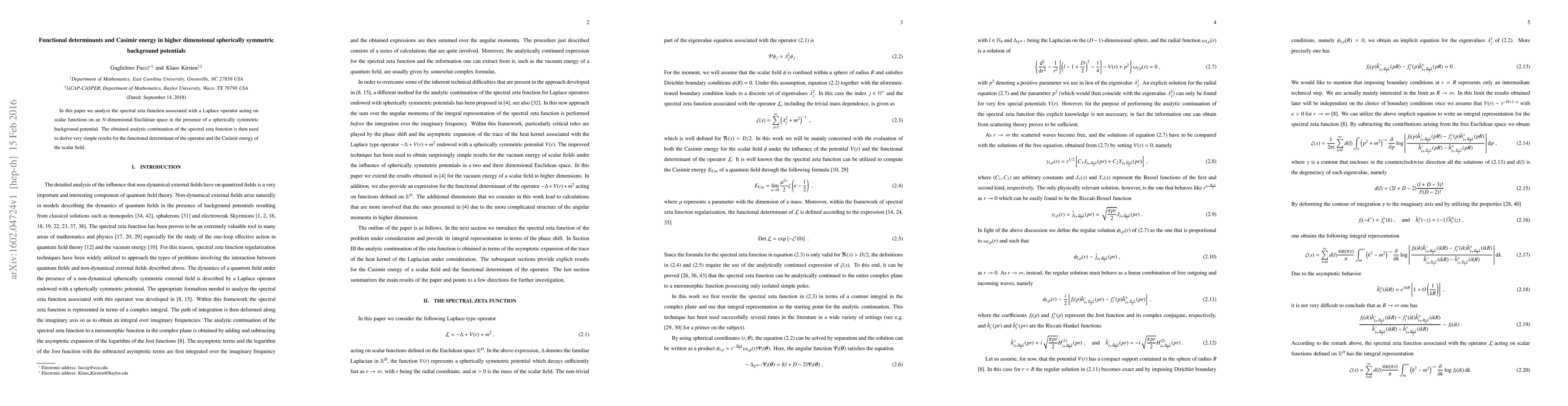 This paper investigates the spectral zeta function for a Laplace operator in N-dimensional Euclidean space with a spherically symmetric background potential, deriving the functional determinant and Casimir energy through analytic continuation. Simple results are obtained for both quantities.