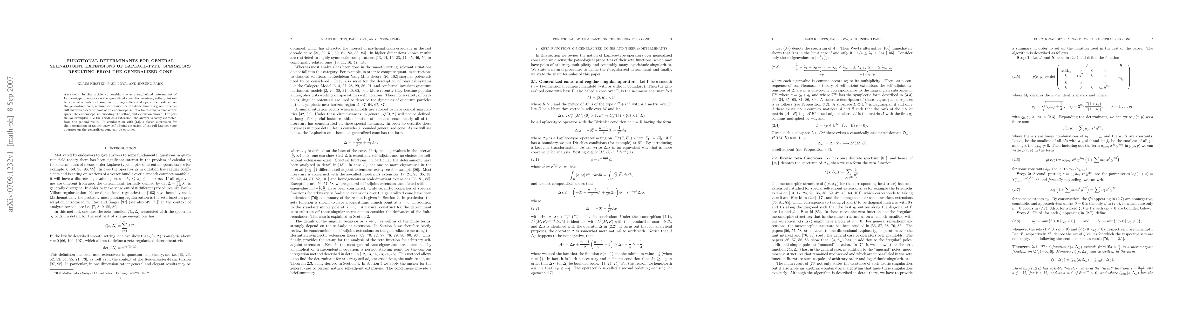 This paper provides a closed expression for the zeta regularized determinant of Laplace-type operators on a generalized cone for any self-adjoint extension. The result involves a determinant related to the chosen extension's endomorphism, with applications to specific extensions like Friedrich's.