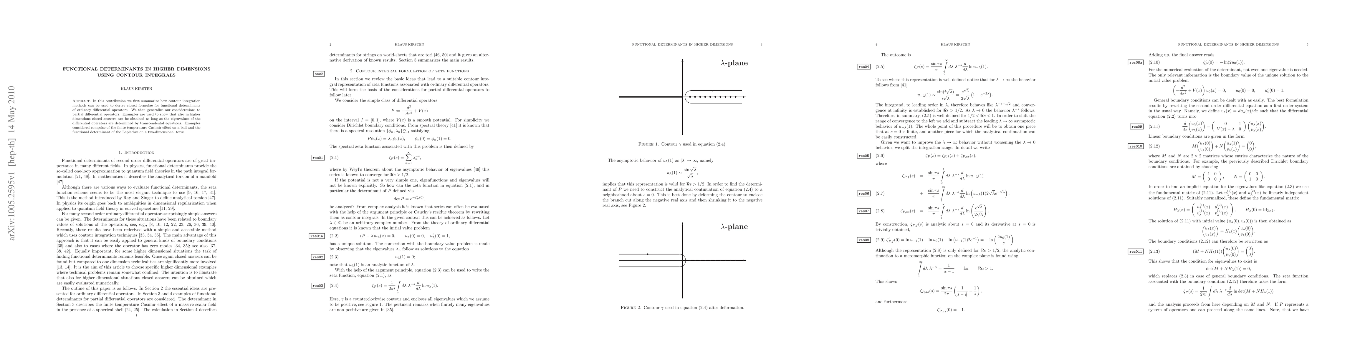 This paper explores the application of contour integration to derive closed formulae for functional determinants of both ordinary and partial differential operators, demonstrating its effectiveness in higher dimensions through examples like the finite temperature Casimir effect and the Laplacian determinant on a torus.