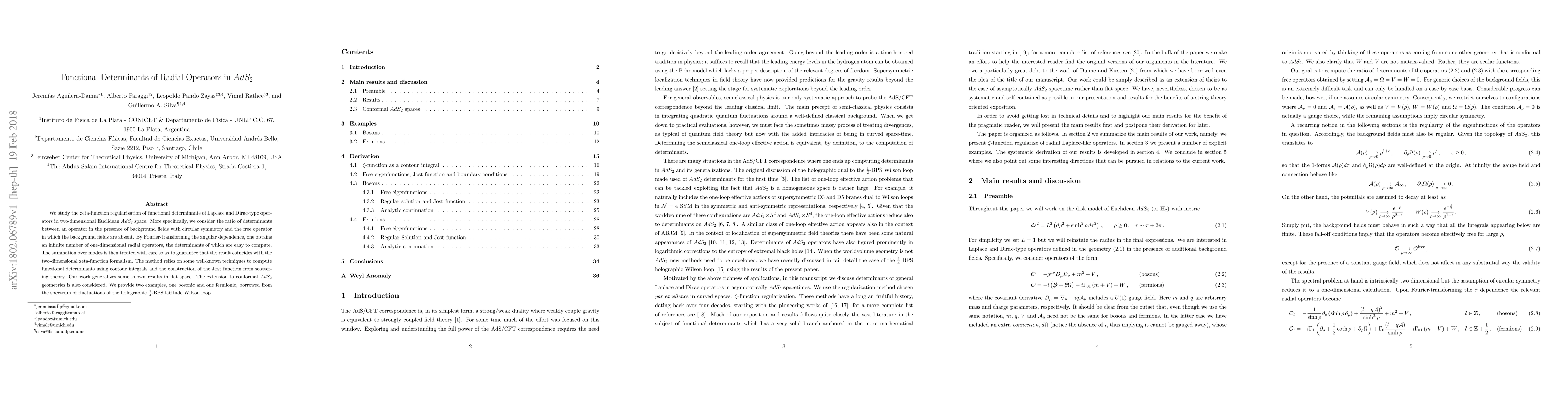 We study the zeta-function regularization of functional determinants of Laplace and Dirac-type operators in two-dimensional Euclidean $AdS_2$ space. More specifically, we consider the ratio of determinants between an operator in the presence of background fields with circular symmetry and the free operator in which the background fields are absent. By Fourier-transforming the angular dependence, one obtains an infinite number of one-dimensional radial operators, the determinants of which are easy to compute. The summation over modes is then treated with care so as to guarantee that the result coincides with the two-dimensional zeta-function formalism. The method relies on some well-known techniques to compute functional determinants using contour integrals and the construction of the Jost function from scattering theory. Our work generalizes some known results in flat space. The extension to conformal $AdS_2$ geometries is also considered. We provide two examples, one bosonic and one fermionic, borrowed from the spectrum of fluctuations of the holographic $\frac{1}{4}$-BPS latitude Wilson loop.
