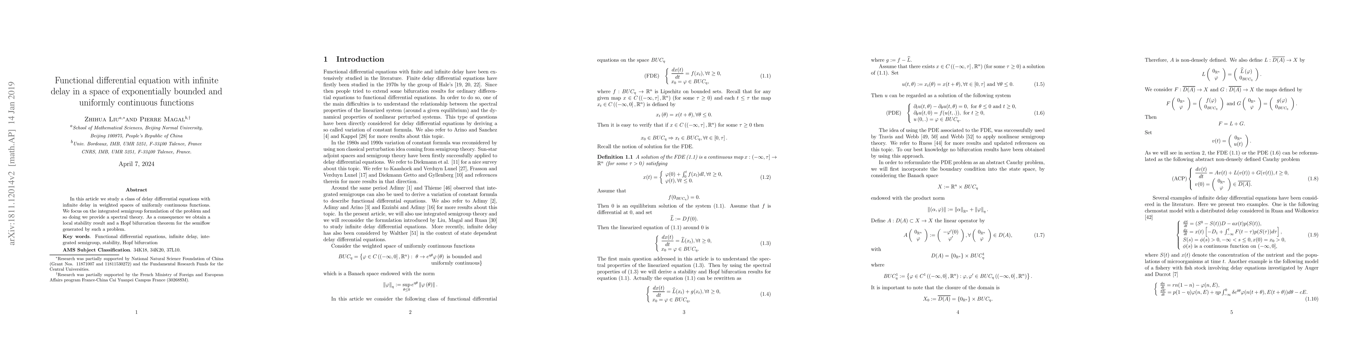 This paper investigates delay differential equations with infinite delay in spaces of uniformly continuous functions, employing an integrated semigroup approach to develop a spectral theory. It concludes with a local stability result and a Hopf bifurcation theorem for the associated semiflow.