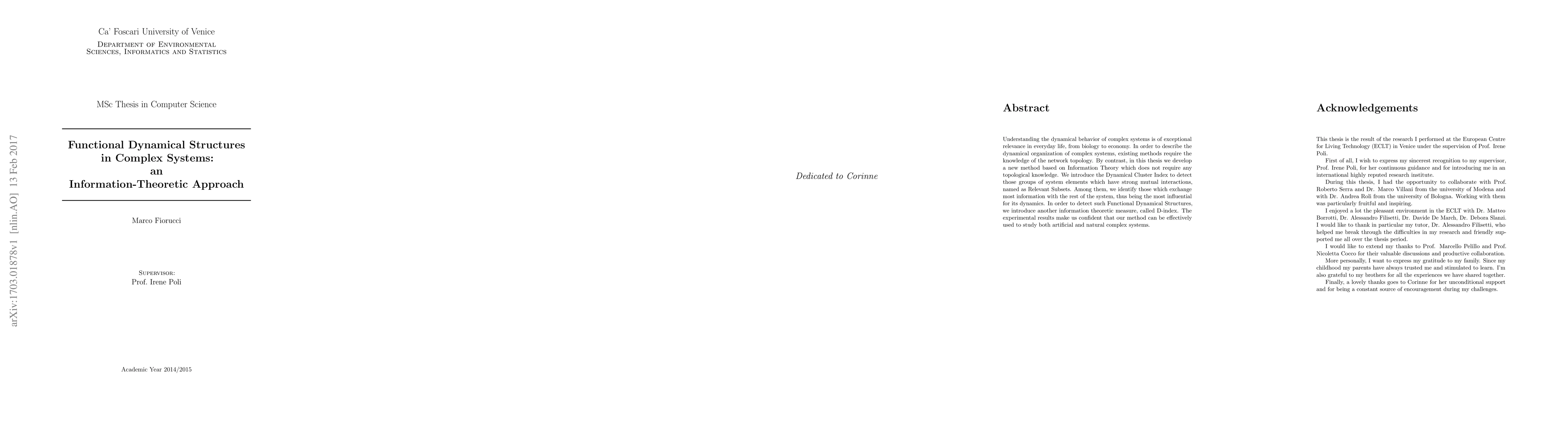 Understanding the dynamical behavior of complex systems is of exceptional relevance in everyday life, from biology to economy. In order to describe the dynamical organization of complex systems, existing methods require the knowledge of the network topology. By contrast, in this thesis we develop a new method based on Information Theory which does not require any topological knowledge. We introduce the Dynamical Cluster Index to detect those groups of system elements which have strong mutual interactions, named as Relevant Subsets. Among them, we identify those which exchange most information with the rest of the system, thus being the most influential for its dynamics. In order to detect such Functional Dynamical Structures, we introduce another information theoretic measure, called D-index. The experimental results make us confident that our method can be effectively used to study both artificial and natural complex systems.