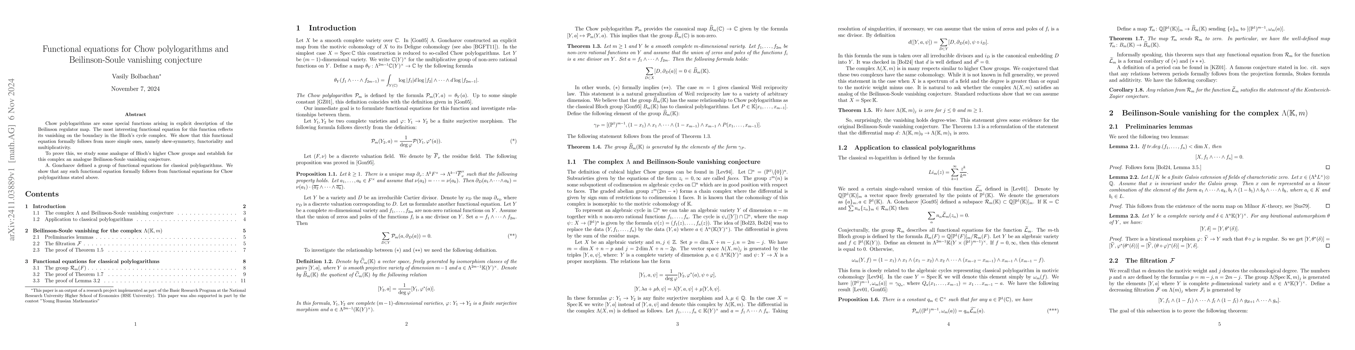 This paper investigates functional equations for Chow polylogarithms, showing their connection to the Beilinson regulator map. It establishes that the primary functional equation, which reflects vanishing on boundaries, can be derived from simpler properties like skew-symmetry, functoriality, and multiplicativity. Additionally, the paper verifies an analogue of the Beilinson-Soule vanishing conjecture for these Chow groups.
