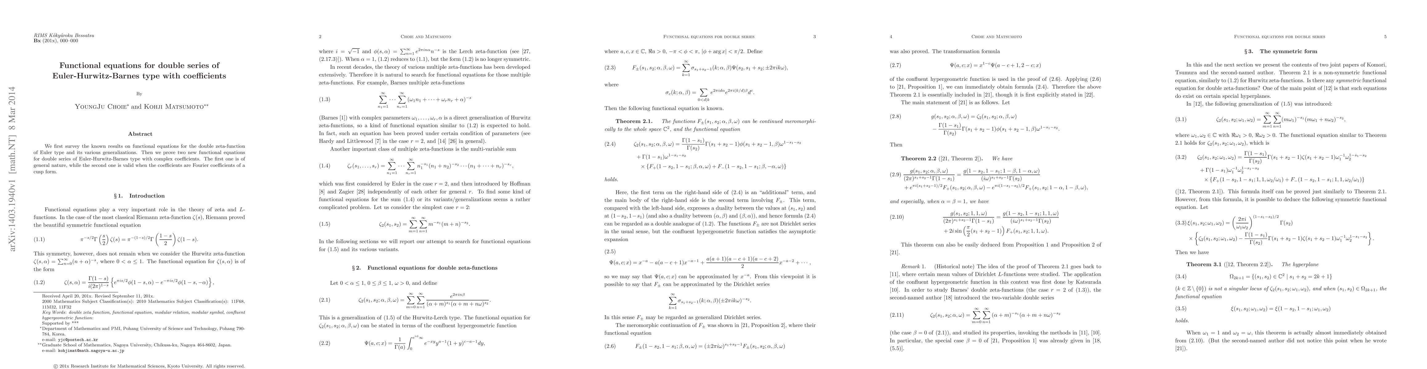This paper surveys existing functional equations for double zeta-functions and proves two new functional equations for double series of Euler-Hurwitz-Barnes type, including one general equation and another specific to Fourier coefficients of cusp forms.