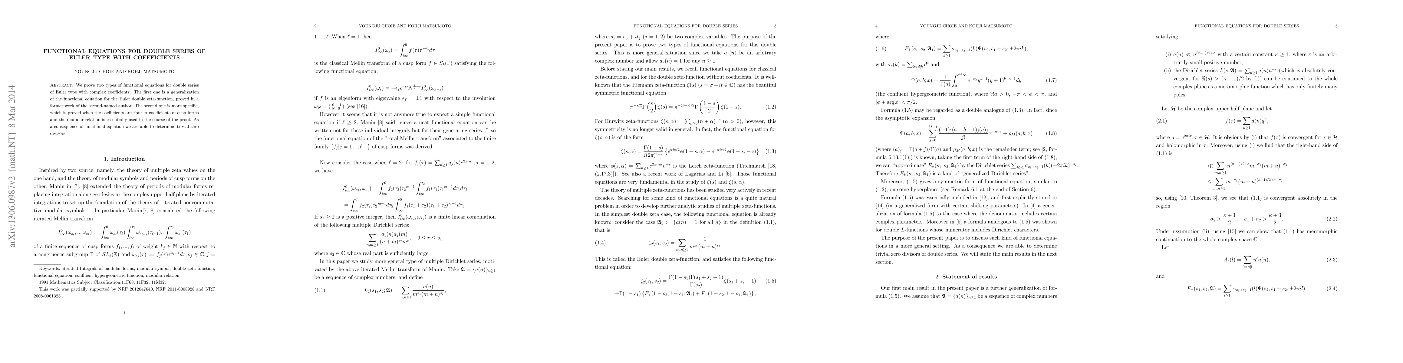 This paper proves two functional equations for double series of Euler type with complex coefficients, generalizing the Euler double zeta-function equation and applying modular relations when coefficients are Fourier coefficients of cusp forms, leading to the determination of trivial zero divisors.