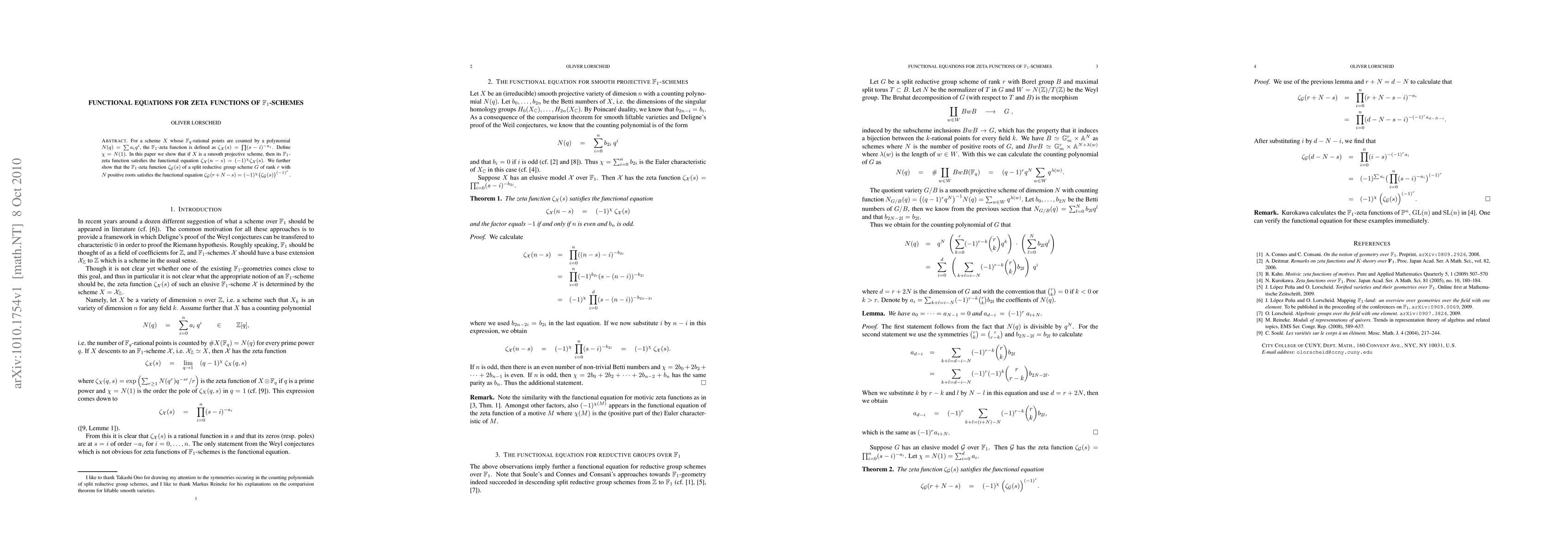This paper establishes functional equations for $\mathbb{F}_1$-zeta functions of smooth projective schemes and split reductive group schemes. Specifically, it proves that the $\mathbb{F}_1$-zeta function of a smooth projective scheme satisfies $\zeta(n-s) = (-1)^\chi \zeta(s)$, and for a split reductive group scheme, it satisfies $\zeta(r+N-s) = (-1)^\chi ( \zeta(s) )^{(-1)^r}$.
