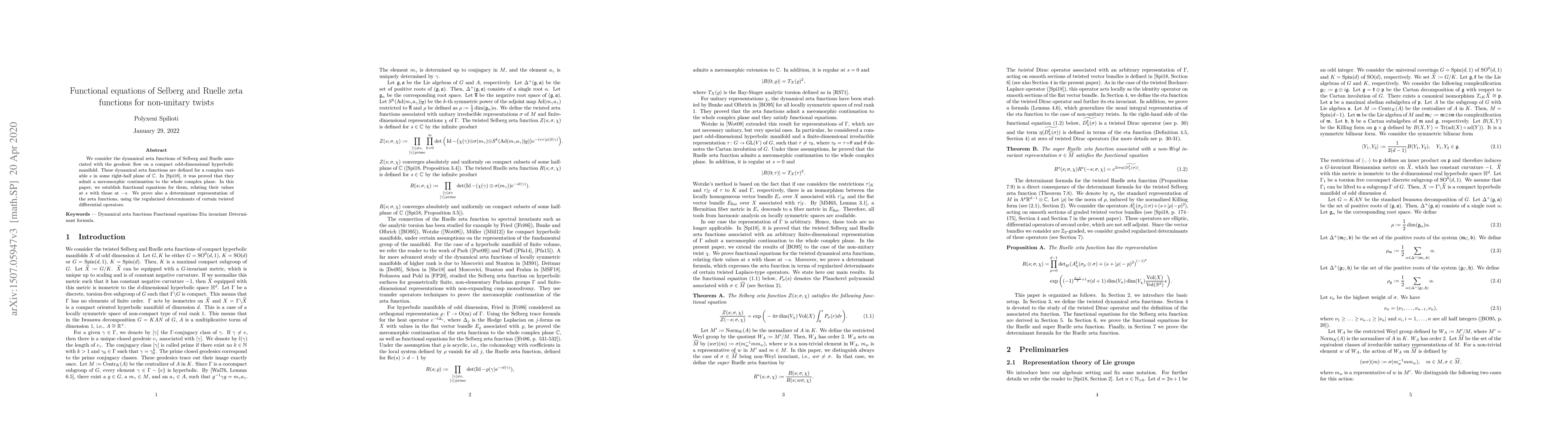 This paper establishes functional equations for Selberg and Ruelle zeta functions for non-unitary twists, proving a relationship between their values at $s$ and $-s$. Additionally, it provides a determinant representation of these zeta functions using regularized determinants of twisted differential operators.