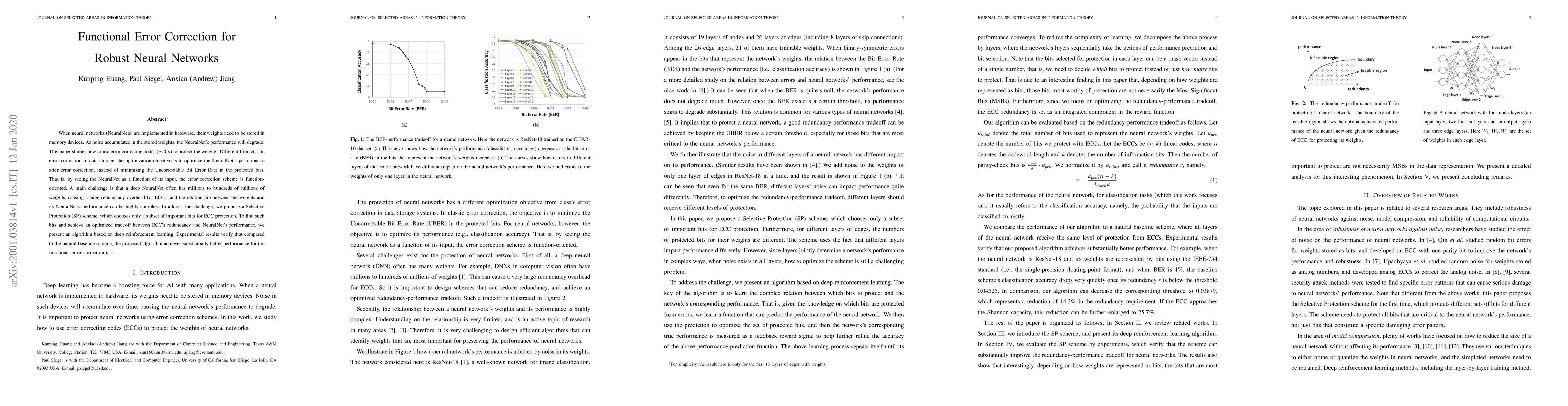 When neural networks (NeuralNets) are implemented in hardware, their weights need to be stored in memory devices. As noise accumulates in the stored weights, the NeuralNet's performance will degrade. This paper studies how to use error correcting codes (ECCs) to protect the weights. Different from classic error correction in data storage, the optimization objective is to optimize the NeuralNet's performance after error correction, instead of minimizing the Uncorrectable Bit Error Rate in the protected bits. That is, by seeing the NeuralNet as a function of its input, the error correction scheme is function-oriented. A main challenge is that a deep NeuralNet often has millions to hundreds of millions of weights, causing a large redundancy overhead for ECCs, and the relationship between the weights and its NeuralNet's performance can be highly complex. To address the challenge, we propose a Selective Protection (SP) scheme, which chooses only a subset of important bits for ECC protection. To find such bits and achieve an optimized tradeoff between ECC's redundancy and NeuralNet's performance, we present an algorithm based on deep reinforcement learning. Experimental results verify that compared to the natural baseline scheme, the proposed algorithm achieves substantially better performance for the functional error correction task.