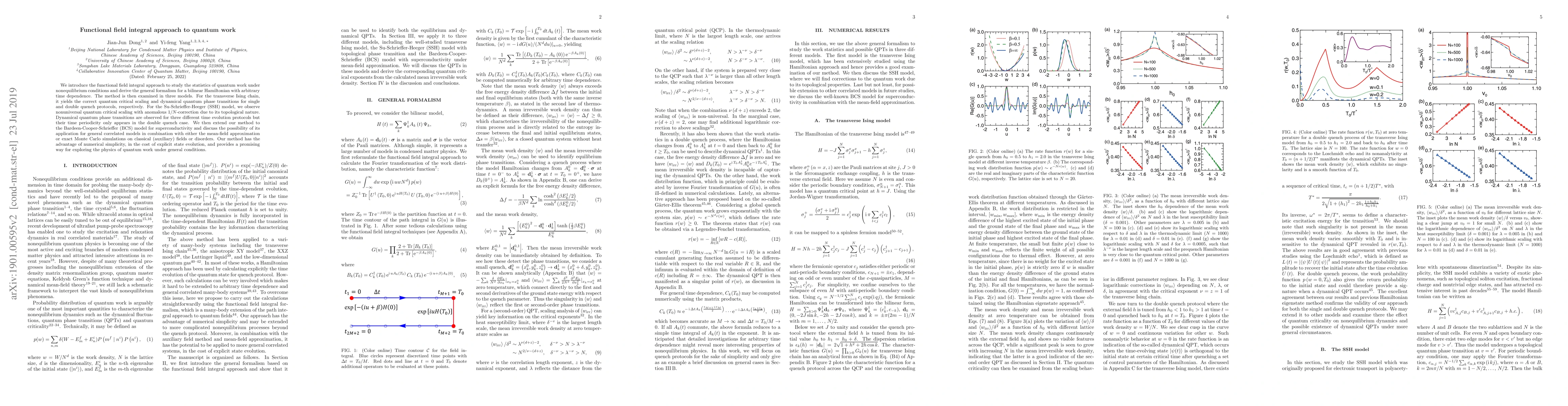 We introduce the functional field integral approach to study the statistics of quantum work under nonequilibrium conditions and derive the general formalism for a bilinear Hamiltonian with arbitrary time dependence. The method is then examined in three models. For the transverse Ising chain, it yields the correct quantum critical scaling and dynamical quantum phase transitions for single and double quench protocols, respectively. For the Su-Schrieffer-Heeger (SSH) model, we observe nonuniversal quantum critical scaling with anomalous $1/N$-correction due to its topological nature. Dynamical quantum phase transitions are observed for three different time evolution protocols but their time periodicity only appears in the double quench case. We then extend our method to the Bardeen-Cooper-Schrieffer (BCS) model for superconductivity and discuss the possibility of its application for general correlated models in combination with either the mean-field approximation or exact Monte Carlo simulations on classical (auxiliary) fields or disorders. Our method has the advantage of numerical simplicity, in the cost of explicit state evolution, and provides a promising way for exploring the physics of quantum work under general conditions.