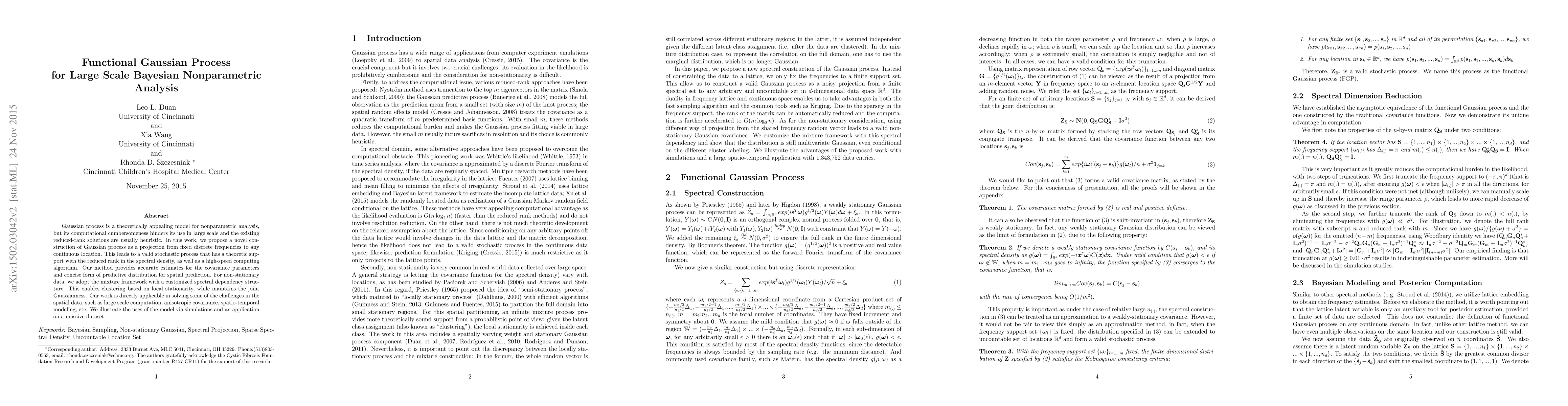 Gaussian process is a theoretically appealing model for nonparametric analysis, but its computational cumbersomeness hinders its use in large scale and the existing reduced-rank solutions are usually heuristic. In this work, we propose a novel construction of Gaussian process as a projection from fixed discrete frequencies to any continuous location. This leads to a valid stochastic process that has a theoretic support with the reduced rank in the spectral density, as well as a high-speed computing algorithm. Our method provides accurate estimates for the covariance parameters and concise form of predictive distribution for spatial prediction. For non-stationary data, we adopt the mixture framework with a customized spectral dependency structure. This enables clustering based on local stationarity, while maintains the joint Gaussianness. Our work is directly applicable in solving some of the challenges in the spatial data, such as large scale computation, anisotropic covariance, spatio-temporal modeling, etc. We illustrate the uses of the model via simulations and an application on a massive dataset.