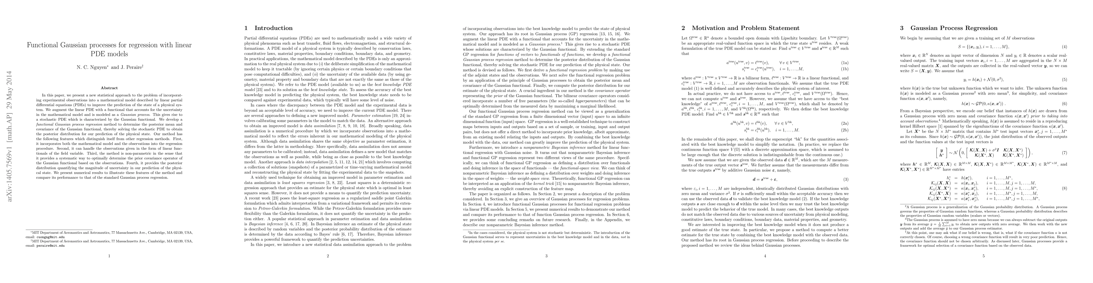 In this paper, we present a new statistical approach to the problem of incorporating experimental observations into a mathematical model described by linear partial differential equations (PDEs) to improve the prediction of the state of a physical system. We augment the linear PDE with a functional that accounts for the uncertainty in the mathematical model and is modeled as a {\em Gaussian process}. This gives rise to a stochastic PDE which is characterized by the Gaussian functional. We develop a {\em functional Gaussian process regression} method to determine the posterior mean and covariance of the Gaussian functional, thereby solving the stochastic PDE to obtain the posterior distribution for our prediction of the physical state. Our method has the following features which distinguish itself from other regression methods. First, it incorporates both the mathematical model and the observations into the regression procedure. Second, it can handle the observations given in the form of linear functionals of the field variable. Third, the method is non-parametric in the sense that it provides a systematic way to optimally determine the prior covariance operator of the Gaussian functional based on the observations. Fourth, it provides the posterior distribution quantifying the magnitude of uncertainty in our prediction of the physical state. We present numerical results to illustrate these features of the method and compare its performance to that of the standard Gaussian process regression.