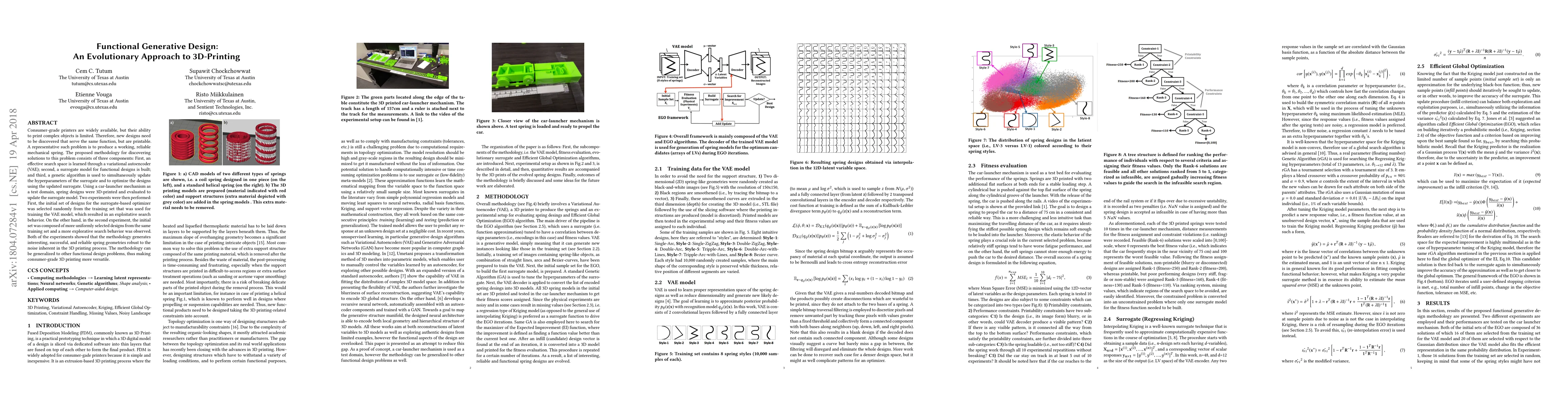 Consumer-grade printers are widely available, but their ability to print complex objects is limited. Therefore, new designs need to be discovered that serve the same function, but are printable. A representative such problem is to produce a working, reliable mechanical spring. The proposed methodology for discovering solutions to this problem consists of three components: First, an effective search space is learned through a variational autoencoder (VAE); second, a surrogate model for functional designs is built; and third, a genetic algorithm is used to simultaneously update the hyperparameters of the surrogate and to optimize the designs using the updated surrogate. Using a car-launcher mechanism as a test domain, spring designs were 3D-printed and evaluated to update the surrogate model. Two experiments were then performed: First, the initial set of designs for the surrogate-based optimizer was selected randomly from the training set that was used for training the VAE model, which resulted in an exploitative search behavior. On the other hand, in the second experiment, the initial set was composed of more uniformly selected designs from the same training set and a more explorative search behavior was observed. Both of the experiments showed that the methodology generates interesting, successful, and reliable spring geometries robust to the noise inherent in the 3D printing process. The methodology can be generalized to other functional design problems, thus making consumer-grade 3D printing more versatile.