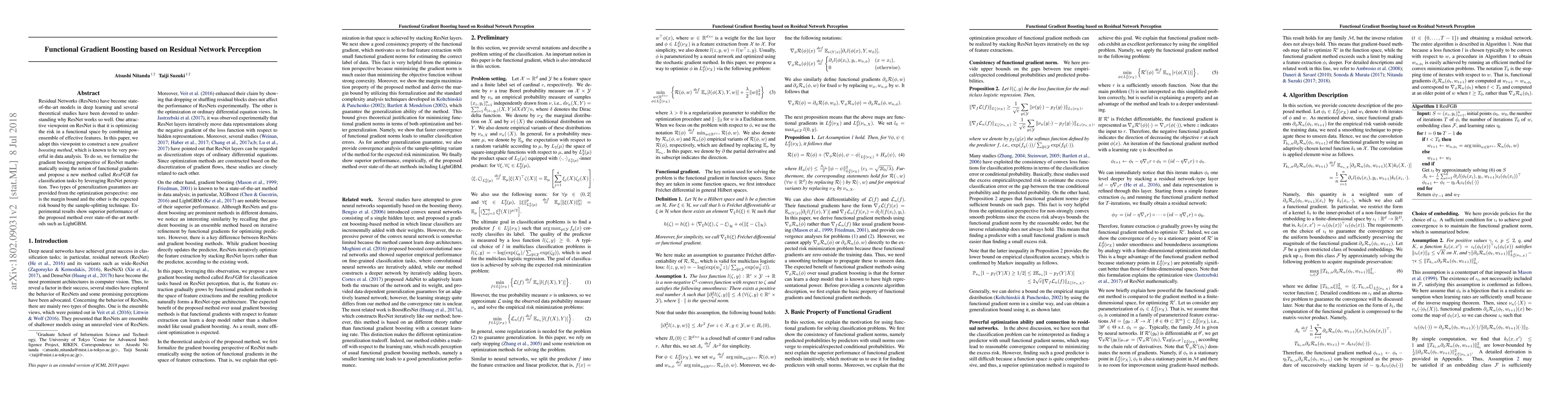 Residual Networks (ResNets) have become state-of-the-art models in deep learning and several theoretical studies have been devoted to understanding why ResNet works so well. One attractive viewpoint on ResNet is that it is optimizing the risk in a functional space by combining an ensemble of effective features. In this paper, we adopt this viewpoint to construct a new gradient boosting method, which is known to be very powerful in data analysis. To do so, we formalize the gradient boosting perspective of ResNet mathematically using the notion of functional gradients and propose a new method called ResFGB for classification tasks by leveraging ResNet perception. Two types of generalization guarantees are provided from the optimization perspective: one is the margin bound and the other is the expected risk bound by the sample-splitting technique. Experimental results show superior performance of the proposed method over state-of-the-art methods such as LightGBM.