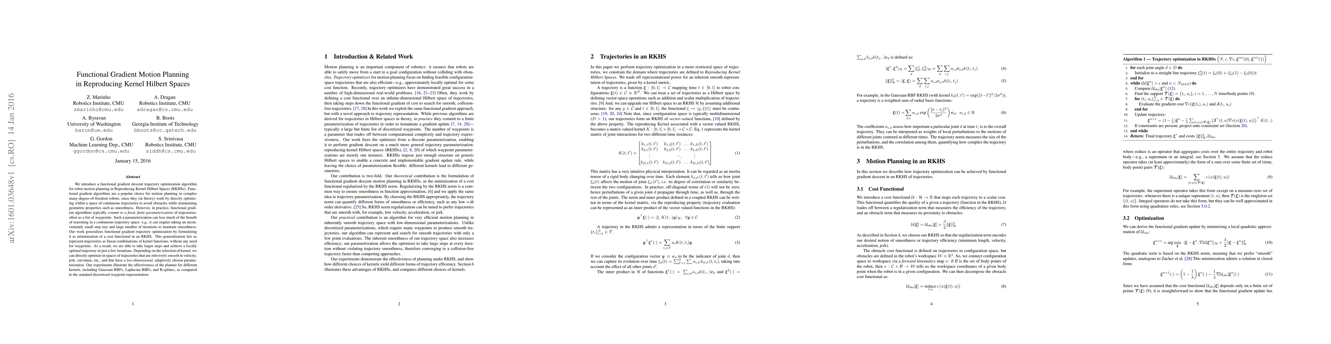 This paper proposes a functional gradient descent algorithm for robot motion planning using Reproducing Kernel Hilbert Spaces (RKHSs) to optimize continuous trajectories directly, avoiding the limitations of waypoint-based parameterizations. The approach enables smoother, more efficient optimization with fewer iterations and larger steps.