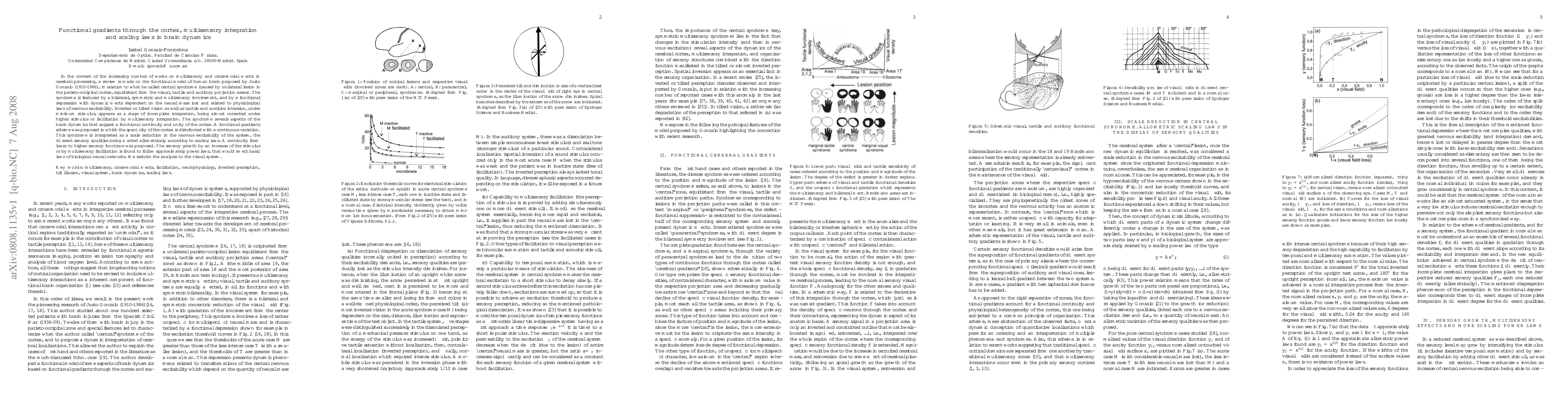 In the context of the increasing number of works on multisensory and cross-modal effects in cerebral processing, a review is made on the functional model of human brain proposed by Justo Gonzalo (1910-1986), in relation to what he called central syndrome (caused by unilateral lesion in the parieto-occipital cortex, equidistant from the visual, tactile and auditory projection areas). The syndrome is featured by a bilateral, symmetric and multisensory involvement, and by a functional depression with dynamic effects dependent on the neural mass lost and related to physiological laws of nervous excitability. Inverted or tilted vision as well as tactile and auditive inversion, under minimum stimulus, appears as a stage of incomplete integration, being almost corrected under higher stimulus or facilitation by multisensory integration. The syndrome reveals aspects of the brain dynamics that suggest a functional continuity and unity of the cortex. A functional gradients scheme was proposed in which the specificity of the cortex is distributed with a continuous variation. This syndrome is interpreted as a scale reduction in the nervous excitability of the system, the different sensory qualities being affected allometricaly according to scaling laws. A continuity from lower to higher sensory functions was proposed. The sensory growth by an increase of the stimulus or by multisensory facilitation is found to follow approximately power laws, that would reflect basic laws of biological neural networks. We restrict the analysis to the visual system.