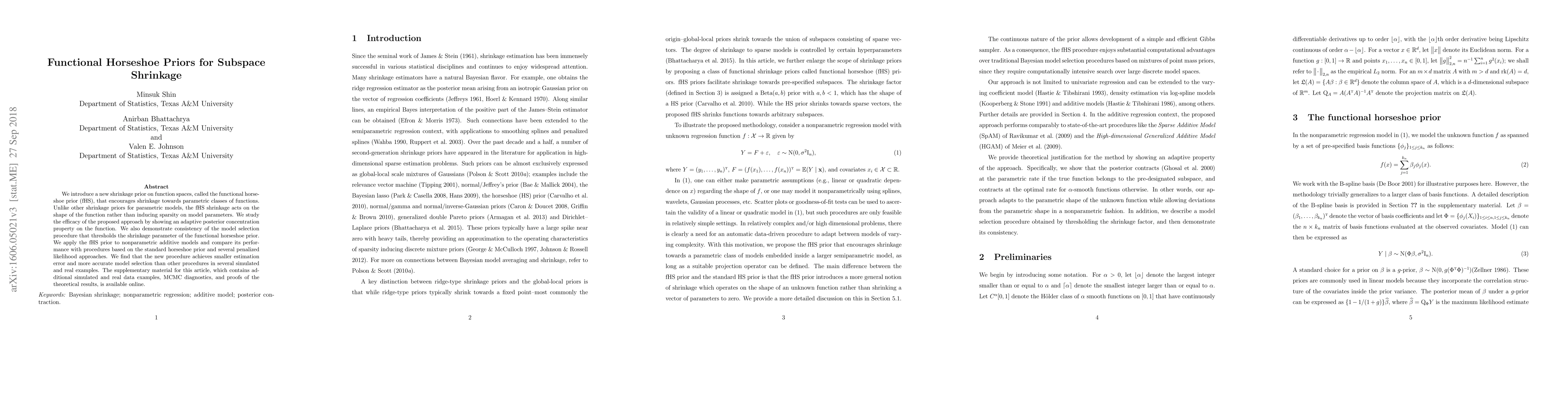 We introduce a new shrinkage prior on function spaces, called the functional horseshoe prior (fHS), that encourages shrinkage towards parametric classes of functions. Unlike other shrinkage priors for parametric models, the fHS shrinkage acts on the shape of the function rather than inducing sparsity on model parameters. We study the efficacy of the proposed approach by showing an adaptive posterior concentration property on the function. We also demonstrate consistency of the model selection procedure that thresholds the shrinkage parameter of the functional horseshoe prior. We apply the fHS prior to nonparametric additive models and compare its performance with procedures based on the standard horseshoe prior and several penalized likelihood approaches. We find that the new procedure achieves smaller estimation error and more accurate model selection than other procedures in several simulated and real examples. The supplementary material for this article, which contains additional simulated and real data examples, MCMC diagnostics, and proofs of the theoretical results, is available online.