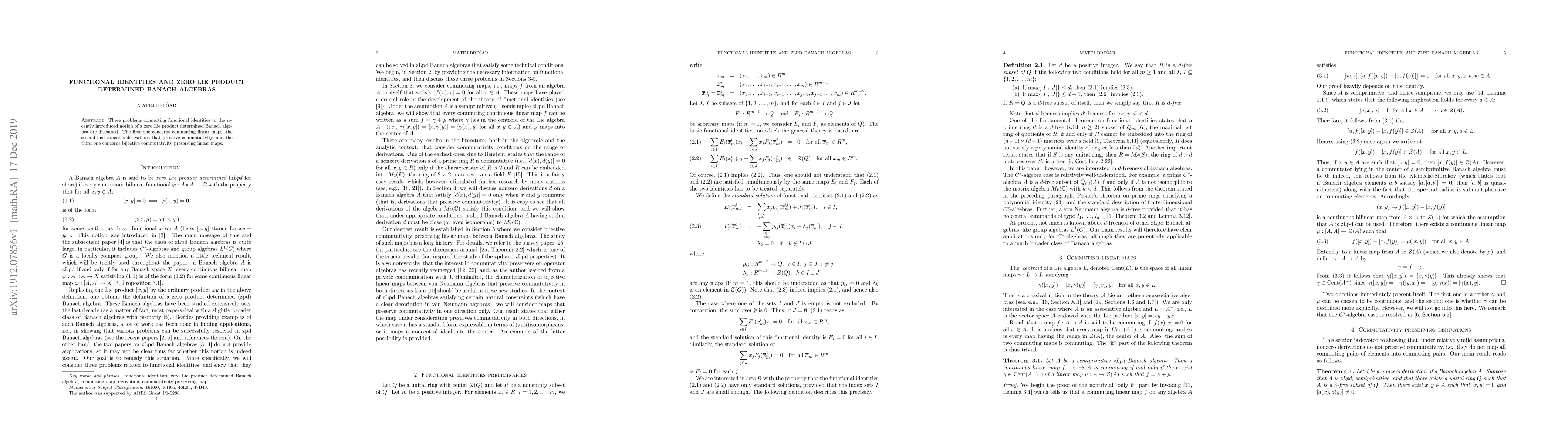 This paper explores the relationship between functional identities and zero Lie product determined Banach algebras, focusing on three problems: commuting linear maps, derivations that preserve commutativity, and bijective commutativity preserving linear maps.