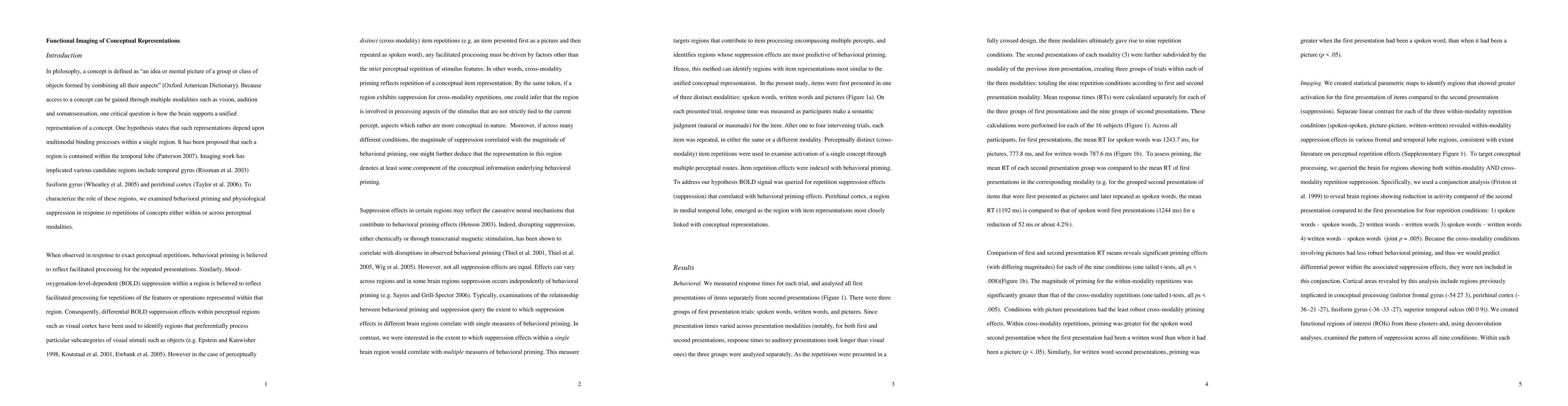This research identifies perirhinal cortex in the temporal lobe as a region involved in conceptual representation using BOLD imaging. The study found suppression effects in this area correlate with behavioral priming across various sensory modalities, supporting the hypothesis of a single region for multimodal binding of conceptual representations.